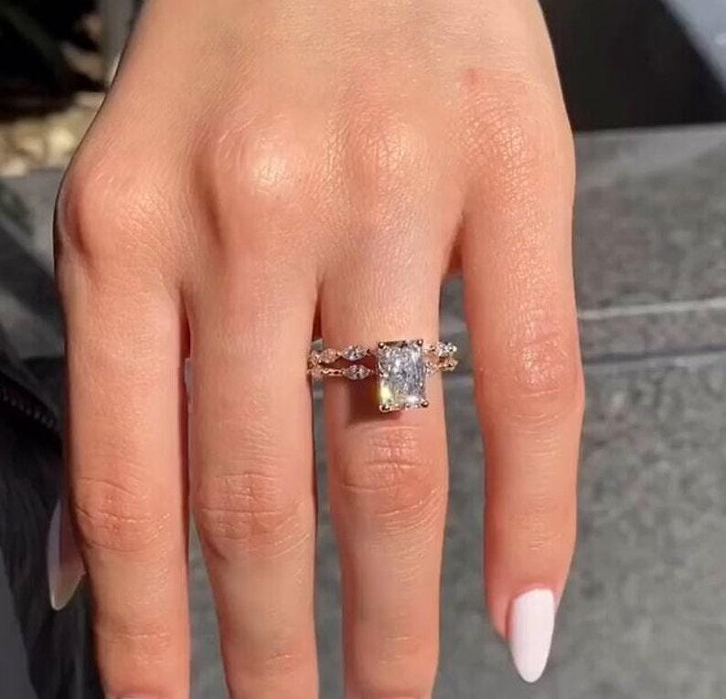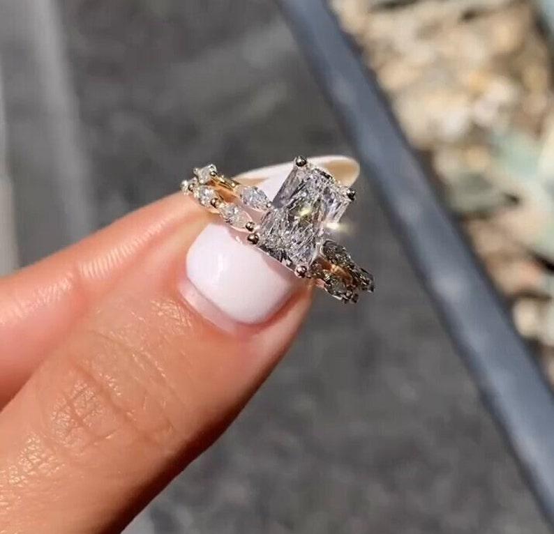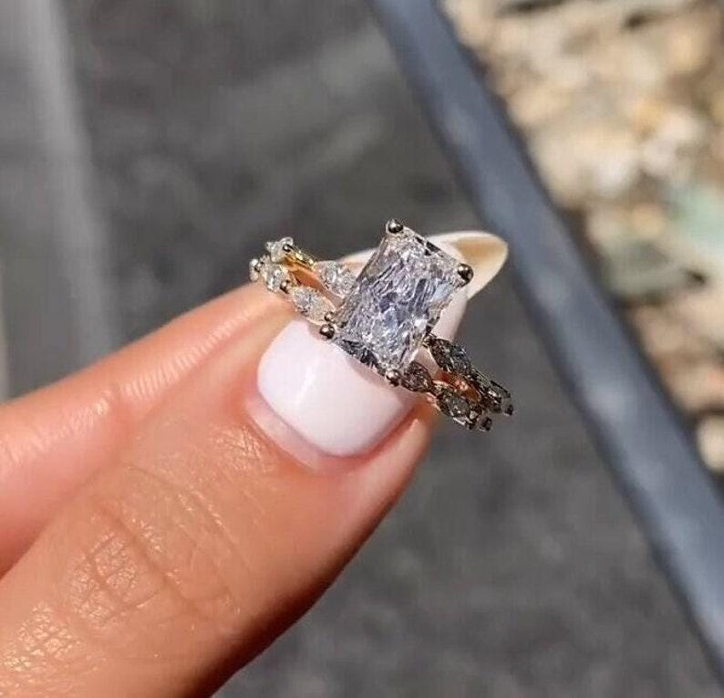 2.00 CT Radiant Cut Moissanite Engagement Ring Set 14K Solid Gold Hidden Halo Marquise Pave Ring Set Anniversary Gift For Her Rings for Women