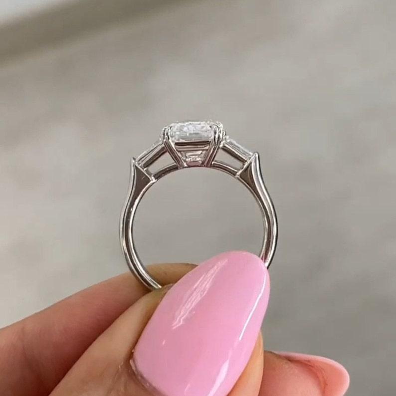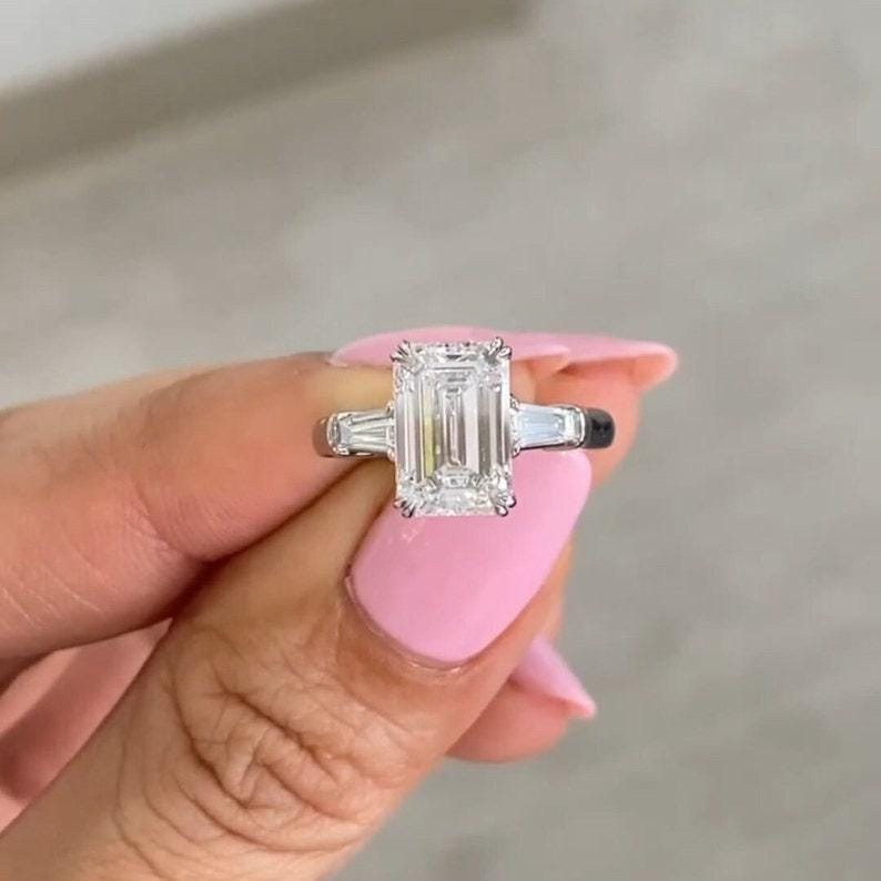 3.00 CT Emerald Cut Three Stone Moissanite Diamond Engagement Ring 14K Solid Gold Side Tapered Baguettes Classy White Gold Wedding Gift Ring