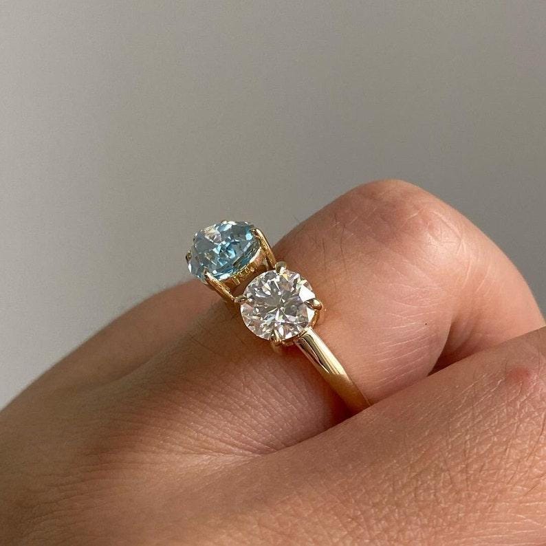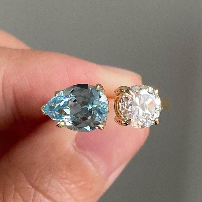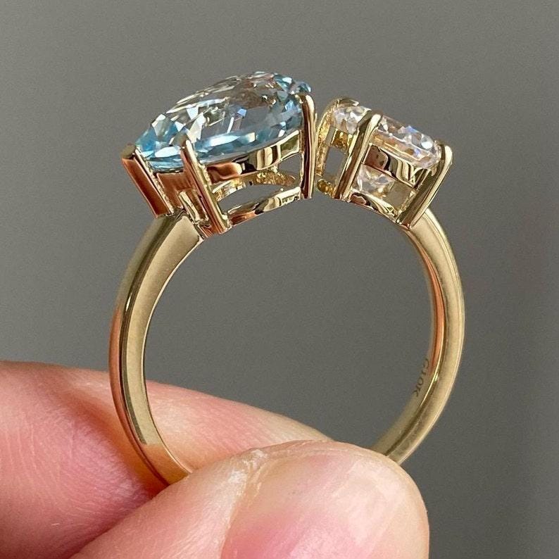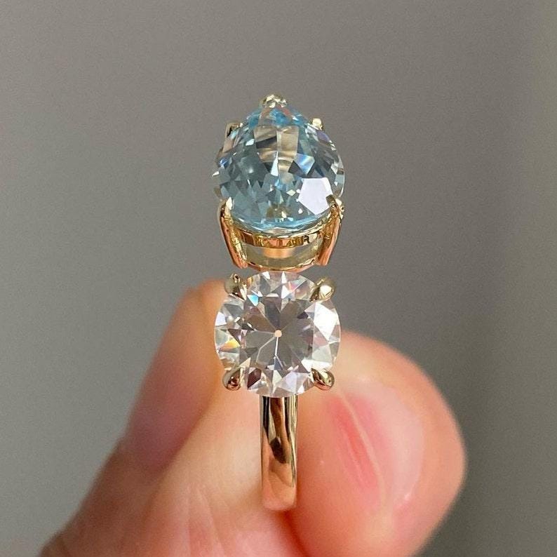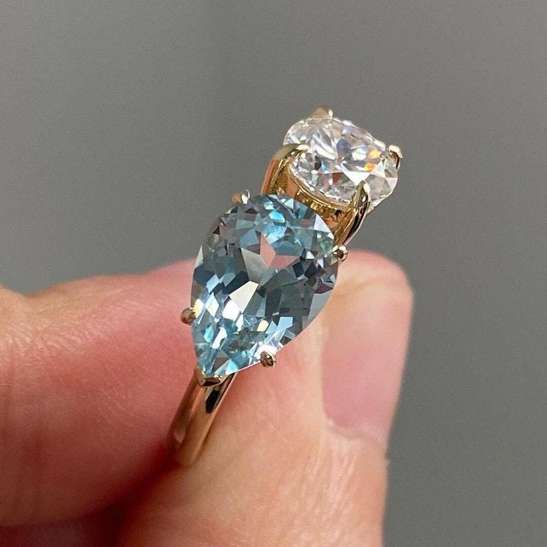 Fancy Aquamarine Color Pear And White Round Cut Moissanite Diamond Engagement Toi Et Moi Ring Vintage Two Stone Wedding Gift Ring For Women