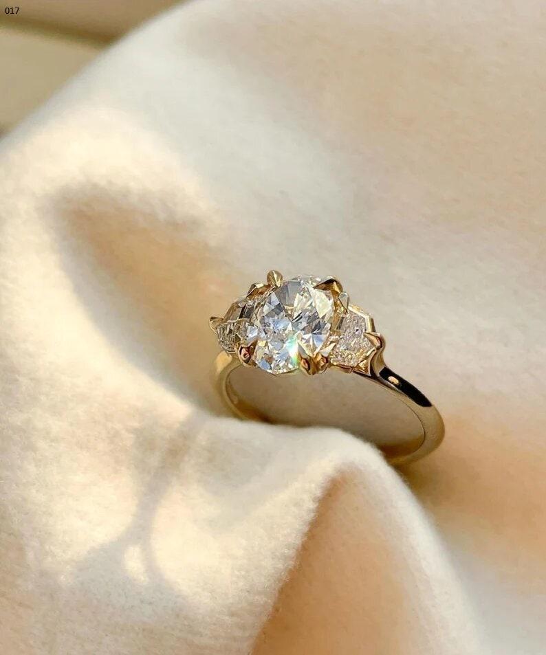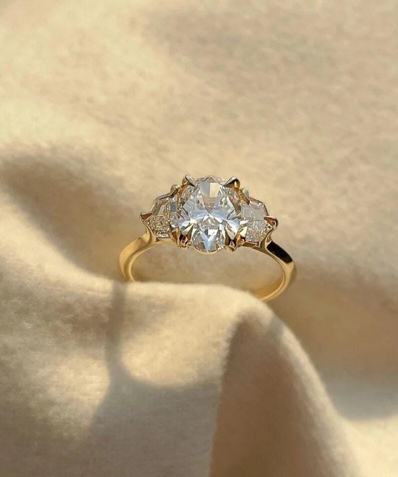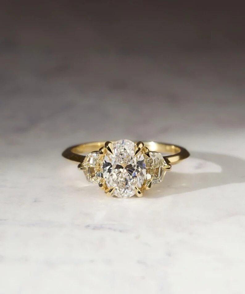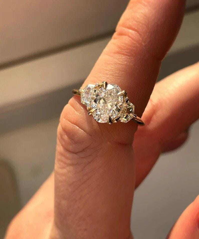 Art Deco 2.50 CT Elongated Oval Cut Moissanite Diamond Engagement Ring 14k Solid Gold Trilogy Cadillac Cut Side Stones Gift Ring For Bride