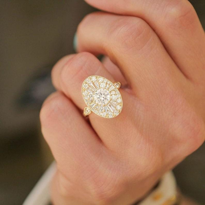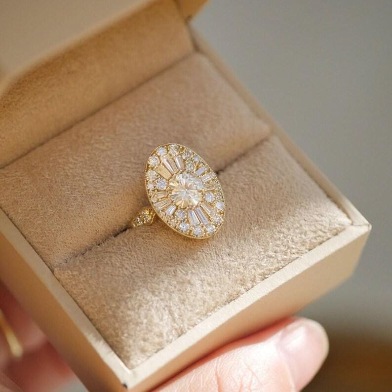 Art Deco Round Cut Ballerina Engagement Ring Round Cut Moissanite Diamond Wedding Ring 14K Gold Mosaic Starburst Halo Unique Proposal Ring