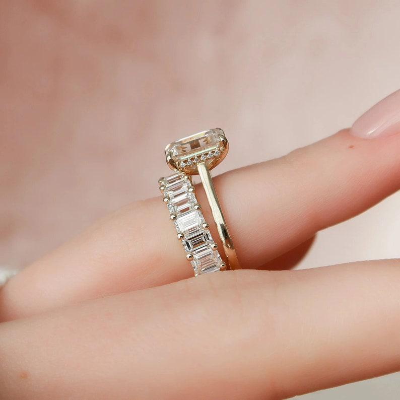 2.50 CT Emerald Cut Moissanite Solitaire Ring With Full Eternity Emerald Cut Wedding Band 14K Solid Gold Hidden Halo Bridal Wedding Ring Set