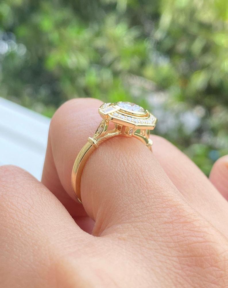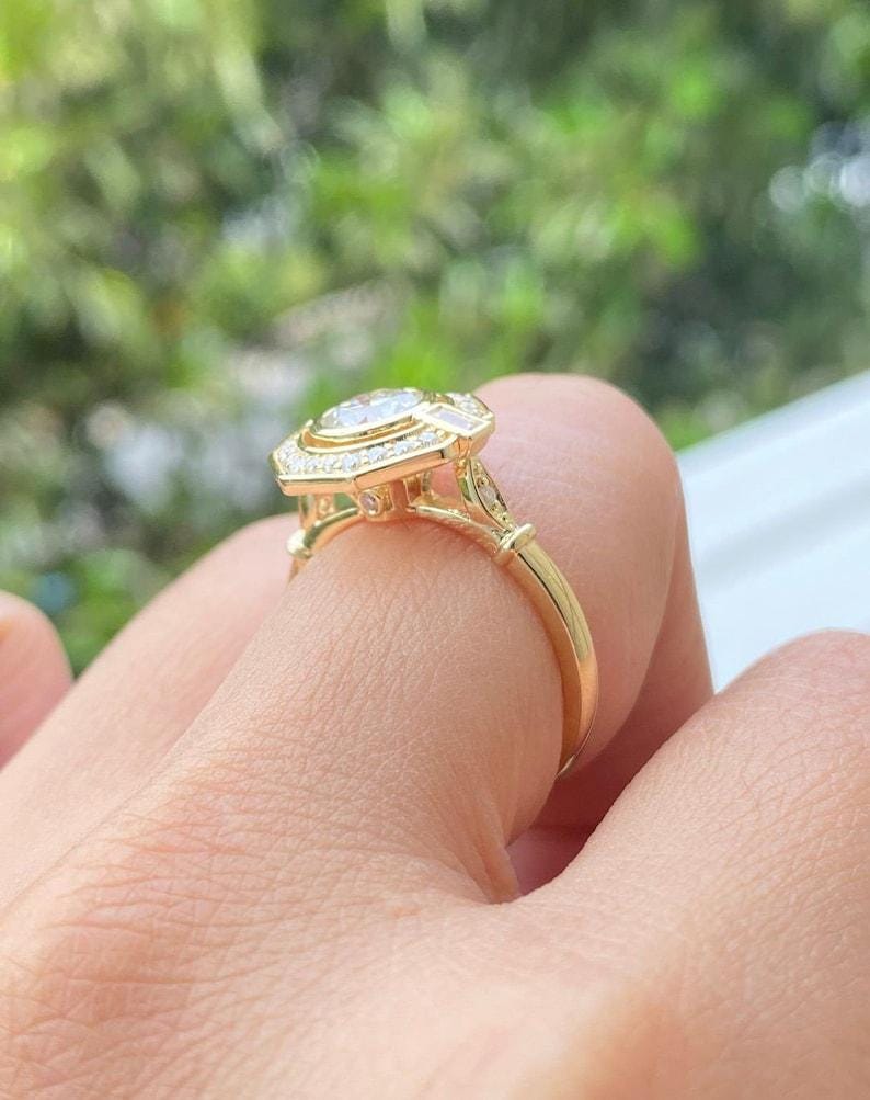 Unique 1.20 CTW Round Cut Moissanite Vintage Halo Set Engagement Ring 14K Solid Yellow Gold Octagon Shape Halo Wedding Ring Bezel Set Ring