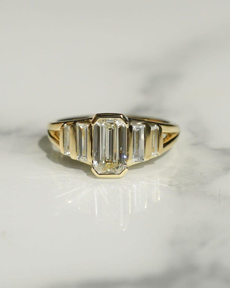 1.50 CT Emerald Cut Half Bezel Set Emerald Center Stone With Bar Set Baguette Cut Side Stones 14K Solid Gold Serious Sparkle Wedding Ring
