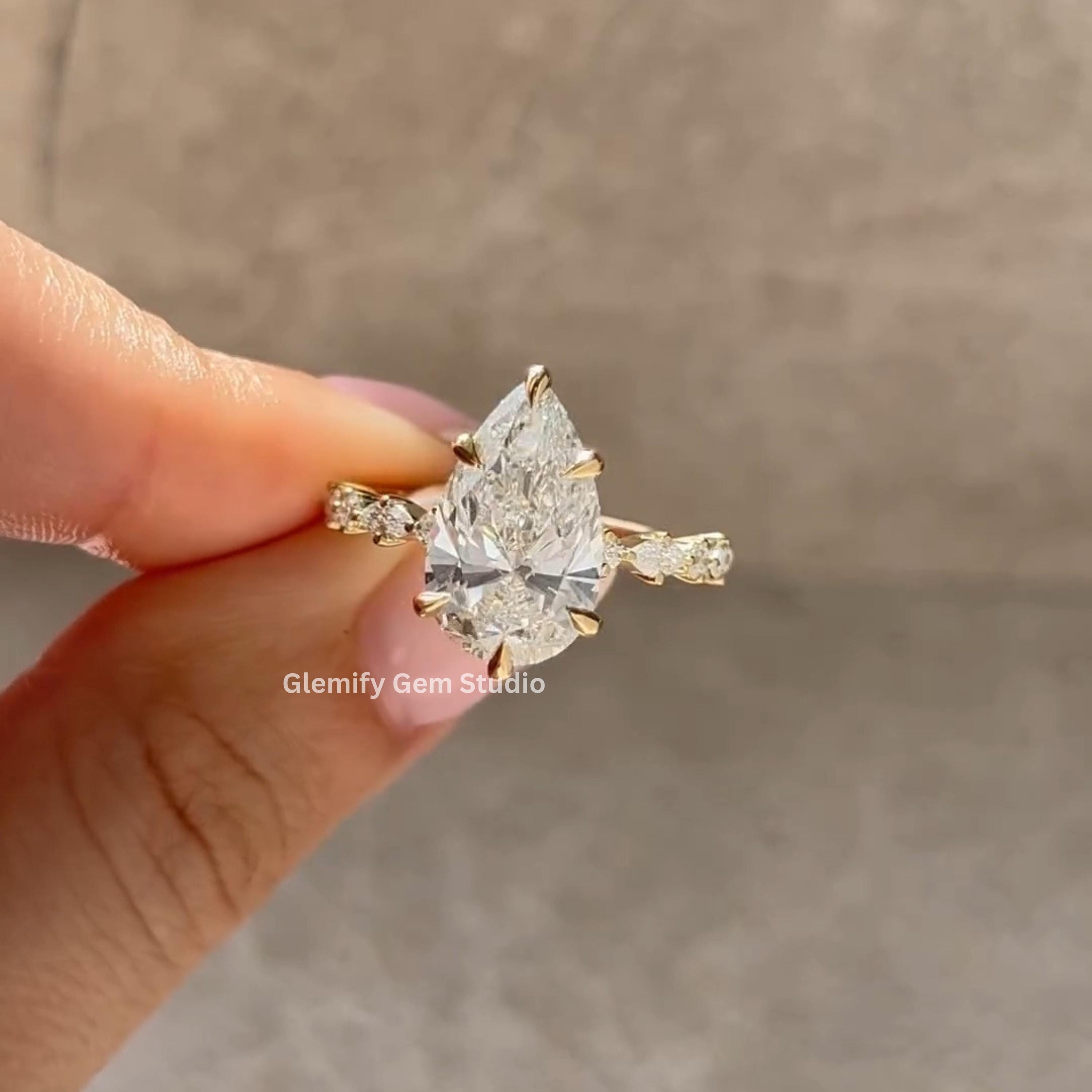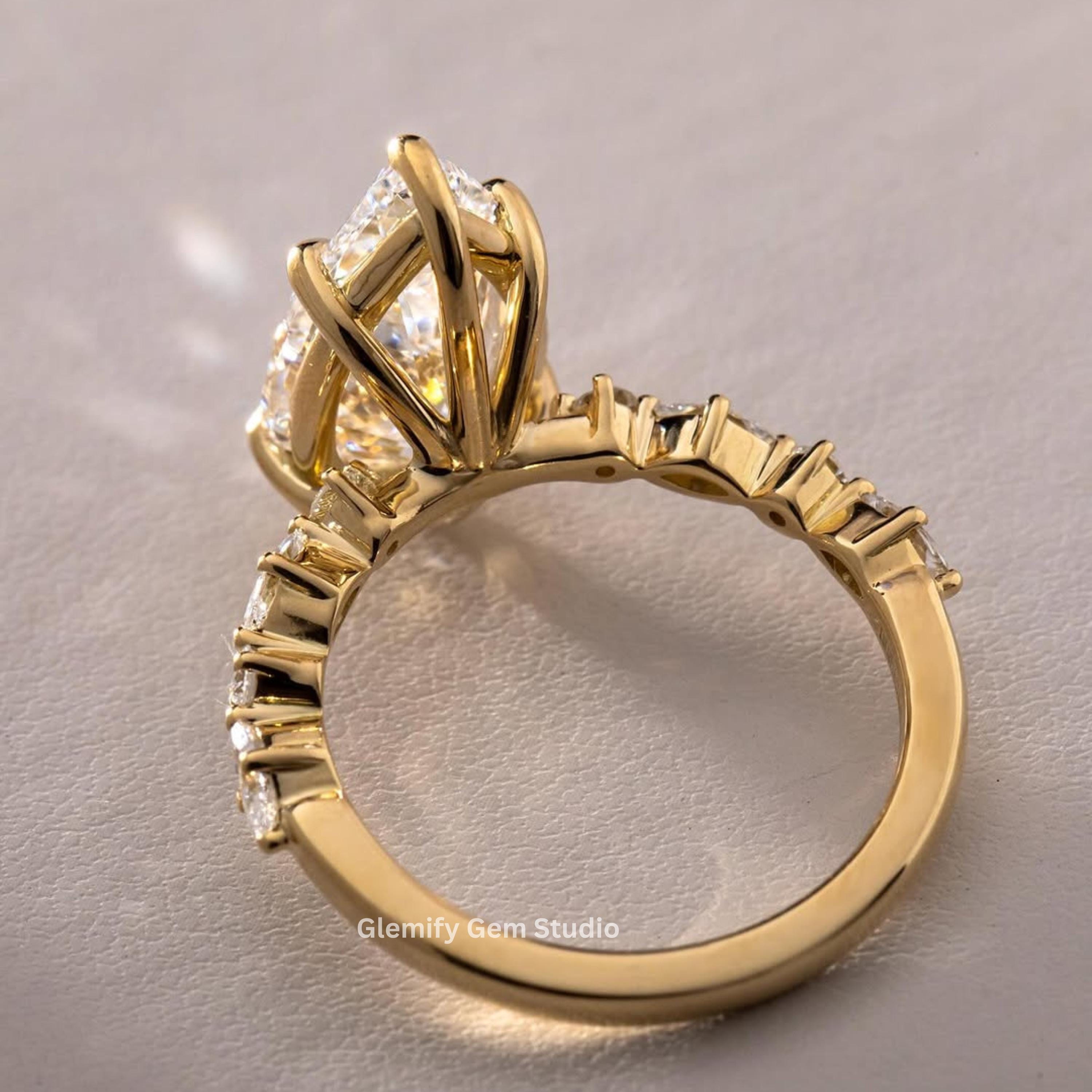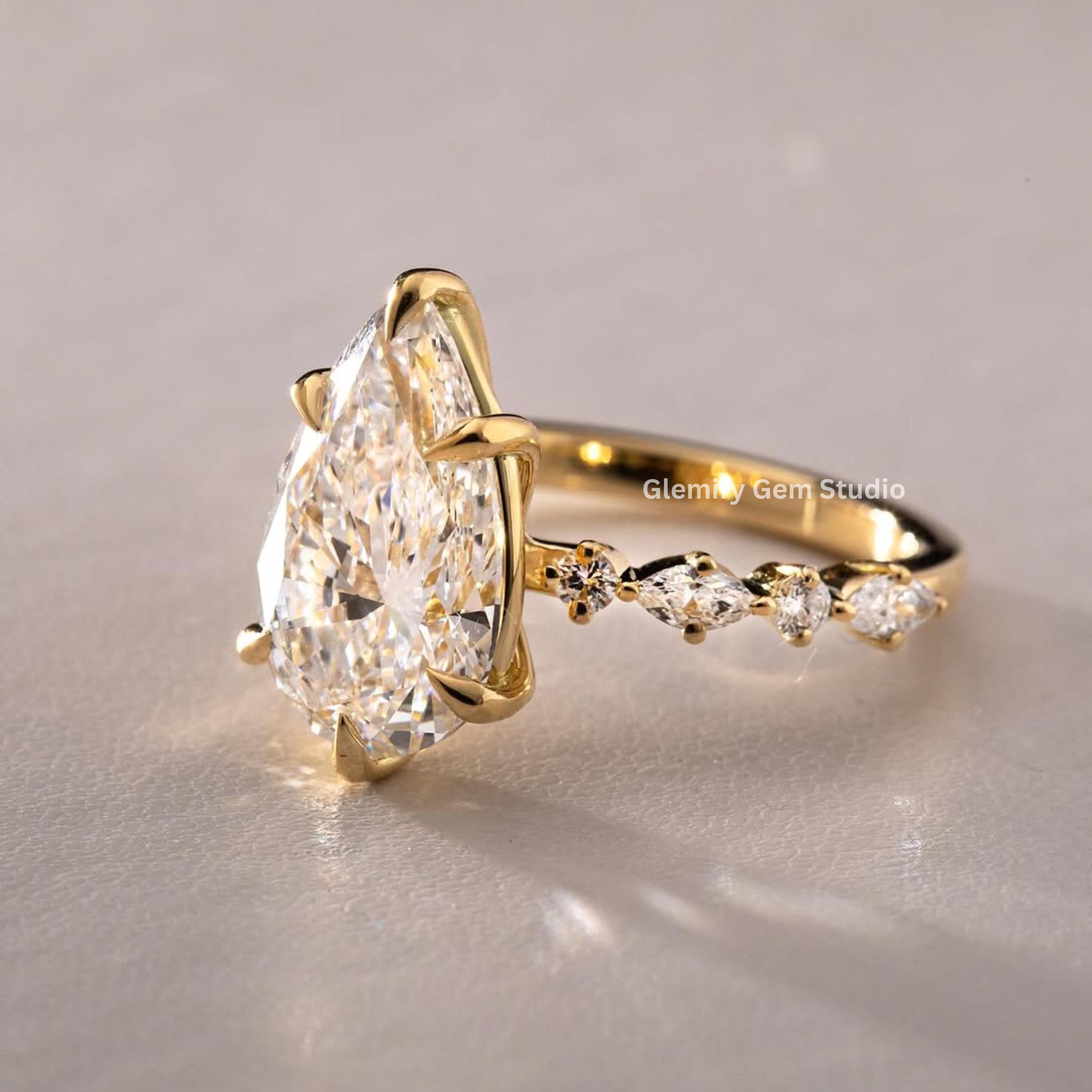 Unique 4 CT Pear Cut Moissanite Engagement Ring With Six Clow Prong 14K Solid Yellow Gold Half Eternity Pave Set Band Wedding Ring Gift Ring