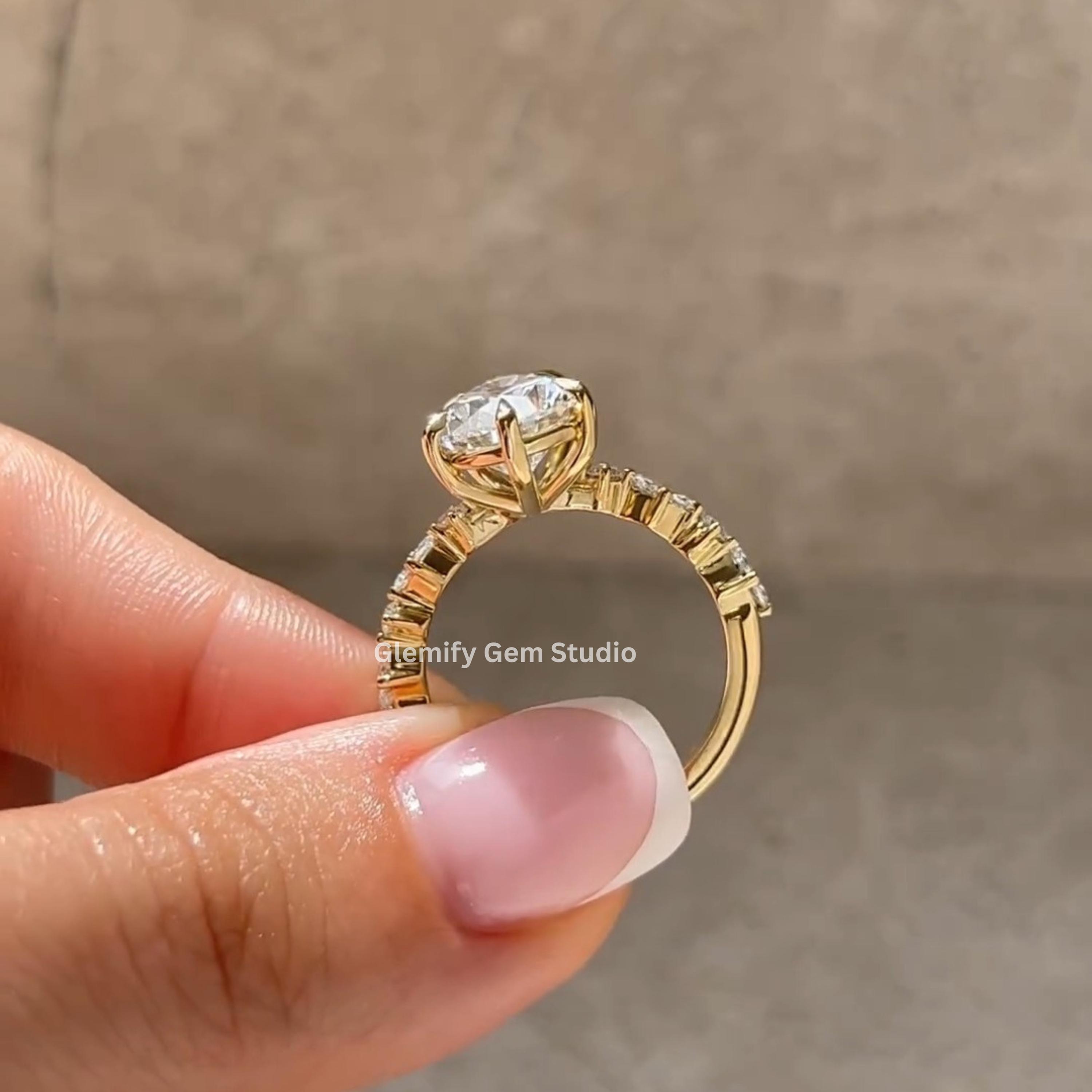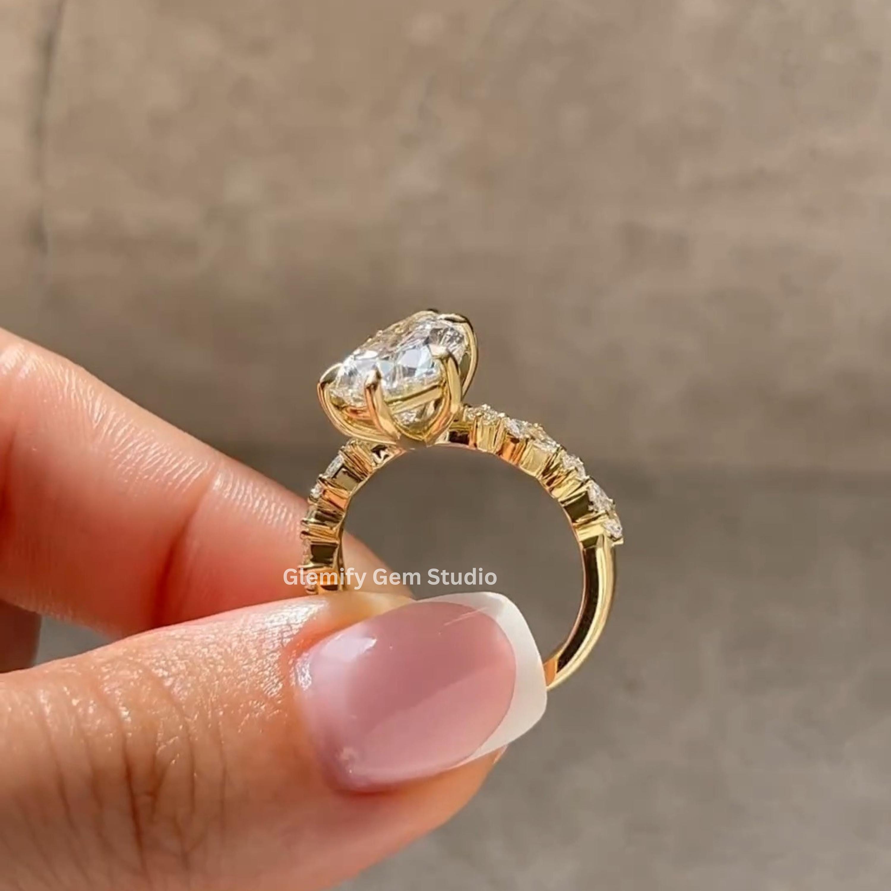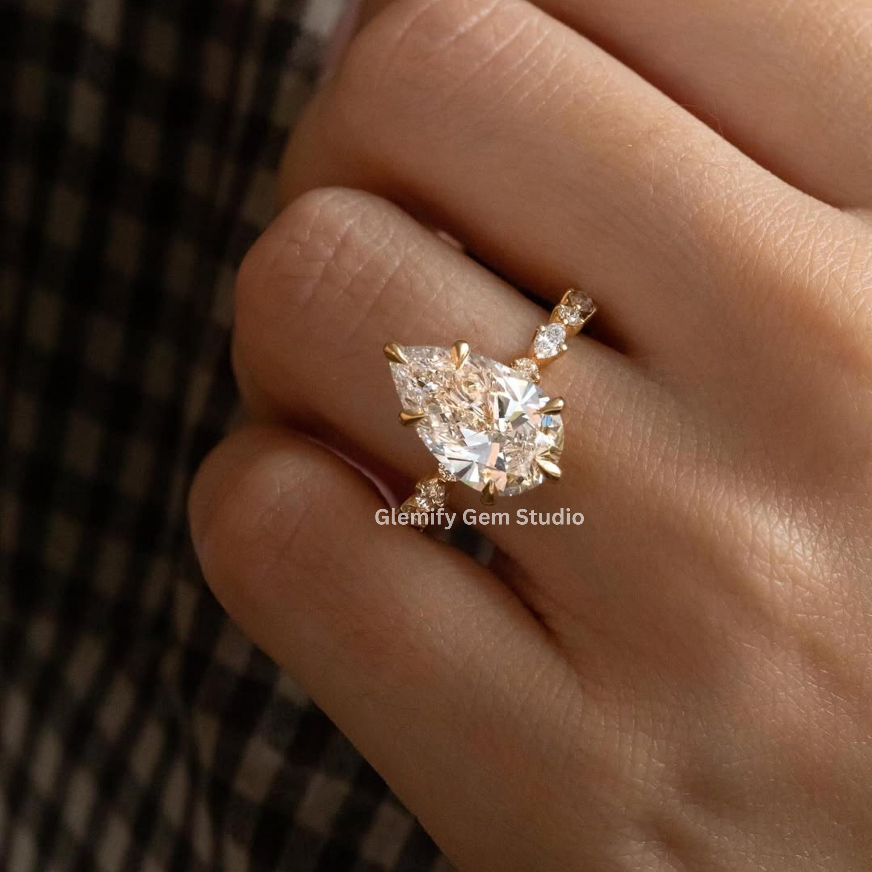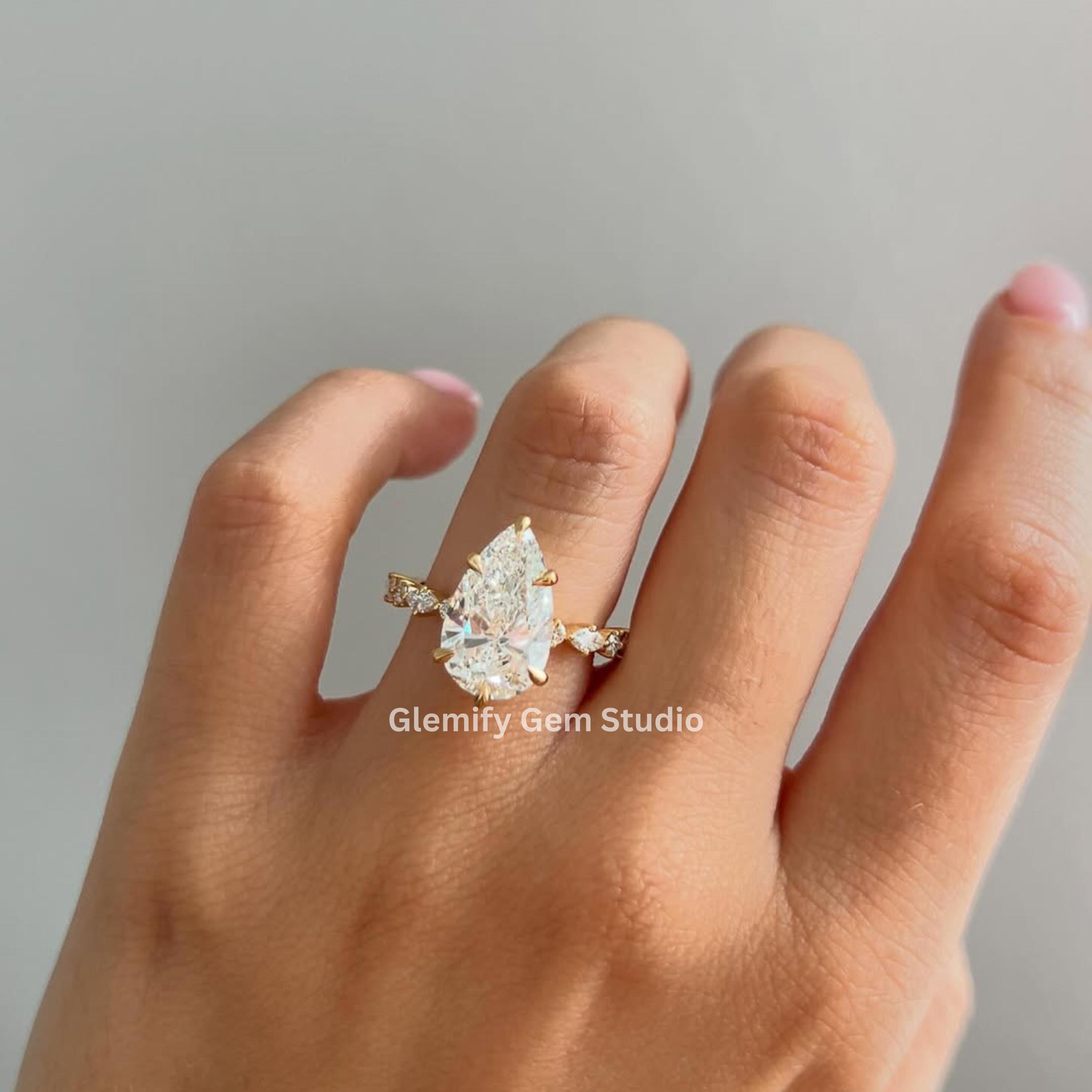 Unique 4 CT Pear Cut Moissanite Engagement Ring With Six Clow Prong 14K Solid Yellow Gold Half Eternity Pave Set Band Wedding Ring Gift Ring
