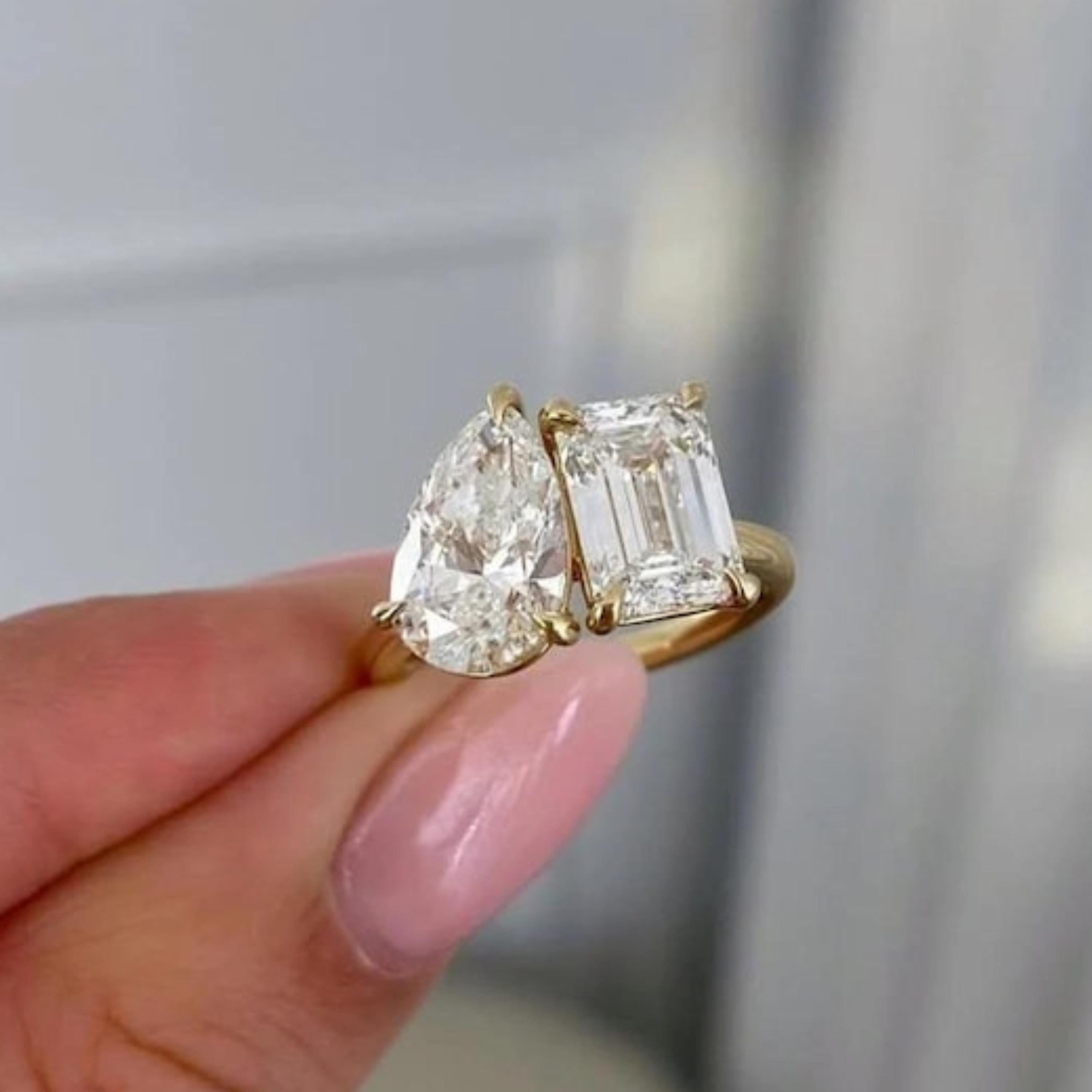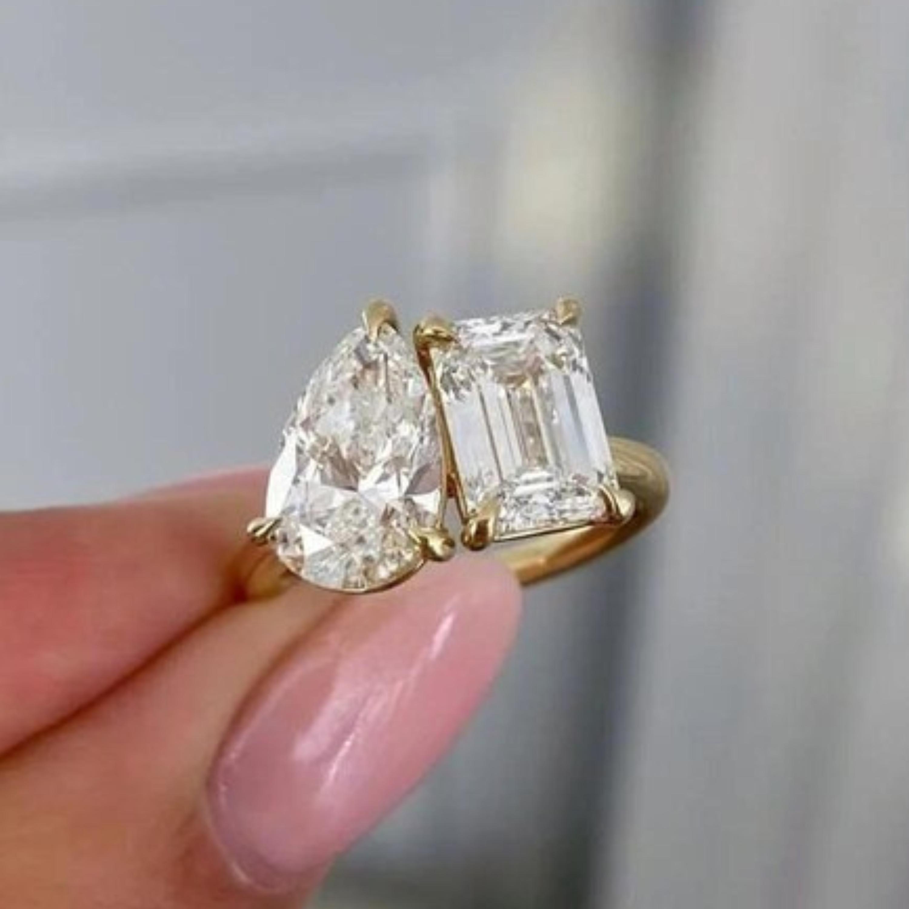 2.50 CT Emerald & Pear Moissanite Two Stone Engagement Ring 14K Solid Solitaire Toi et Moi Gold Wedding Ring Anniversary Gift Ring For Her