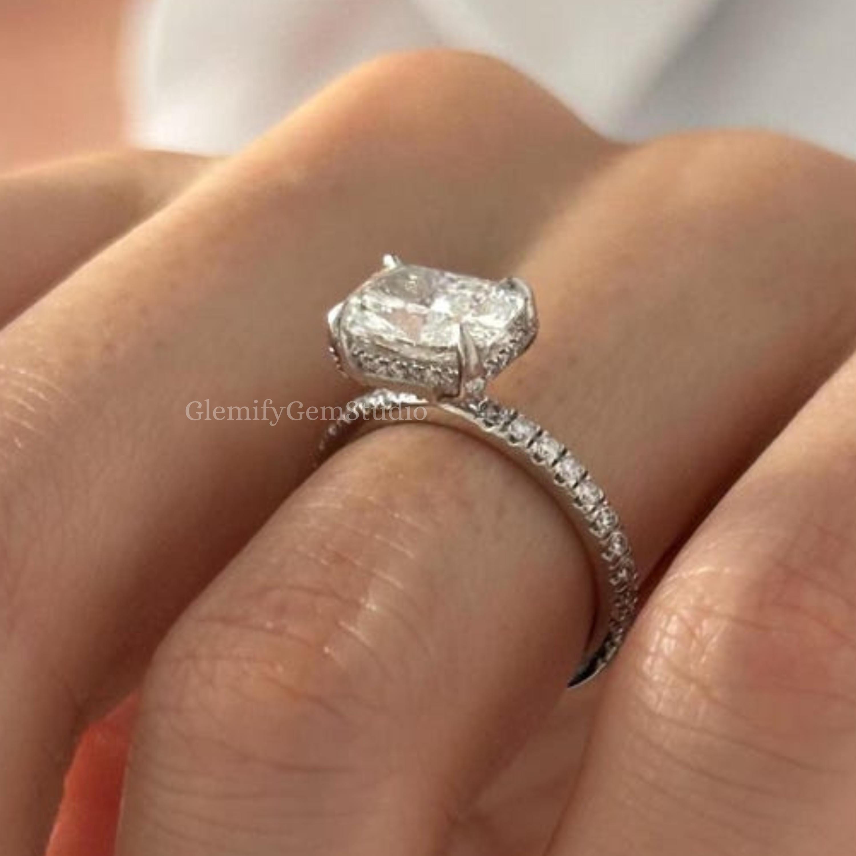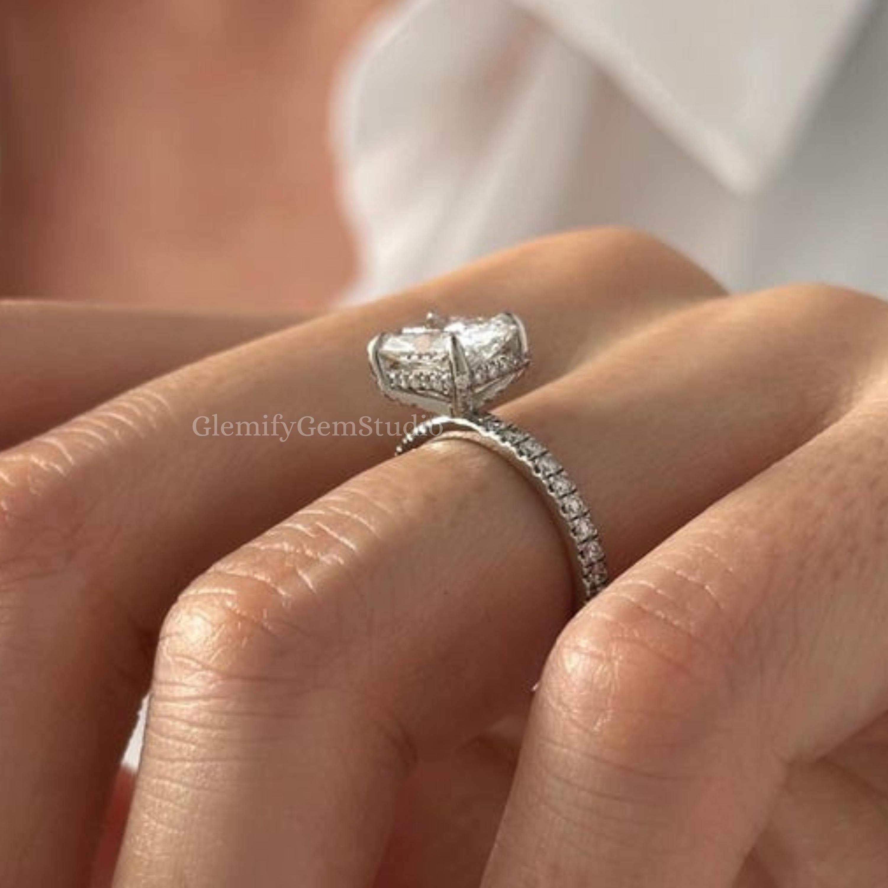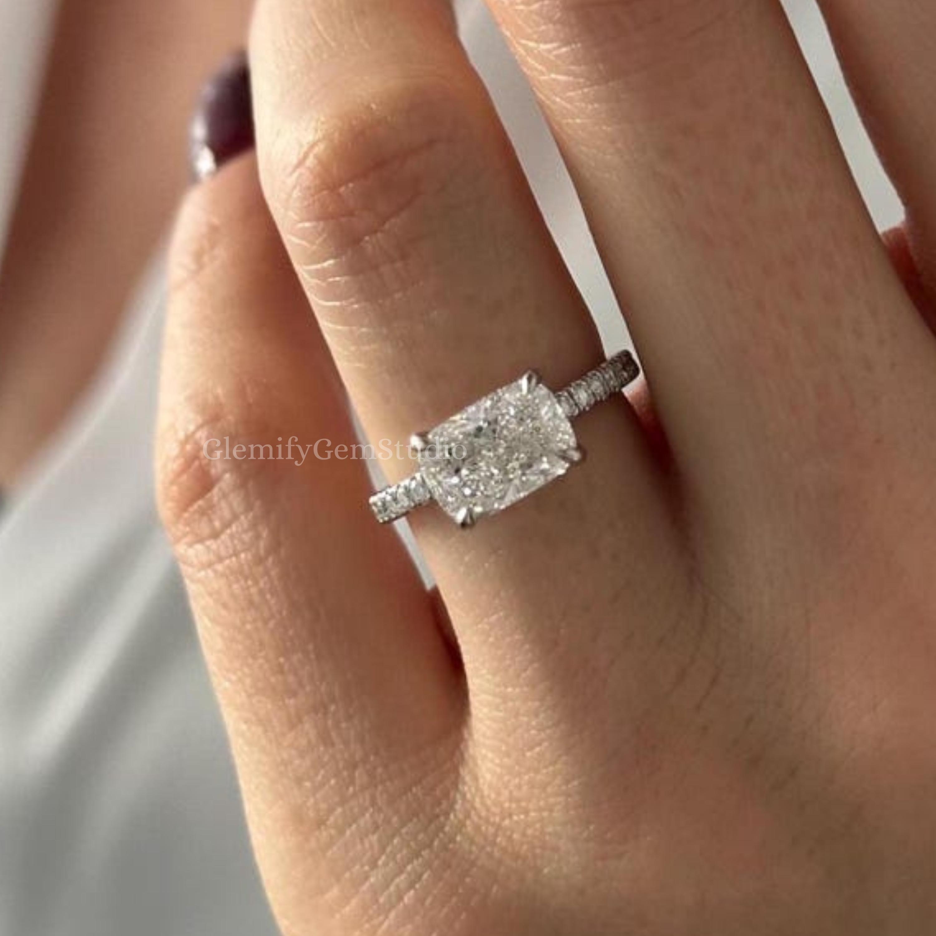 Unique 2 CT East West Elongated Cushion Cut Moissanite Engagement Ring 14K Solid Gold Hidden Halo & 2MM Pave Set Wedding Anniversary Ring