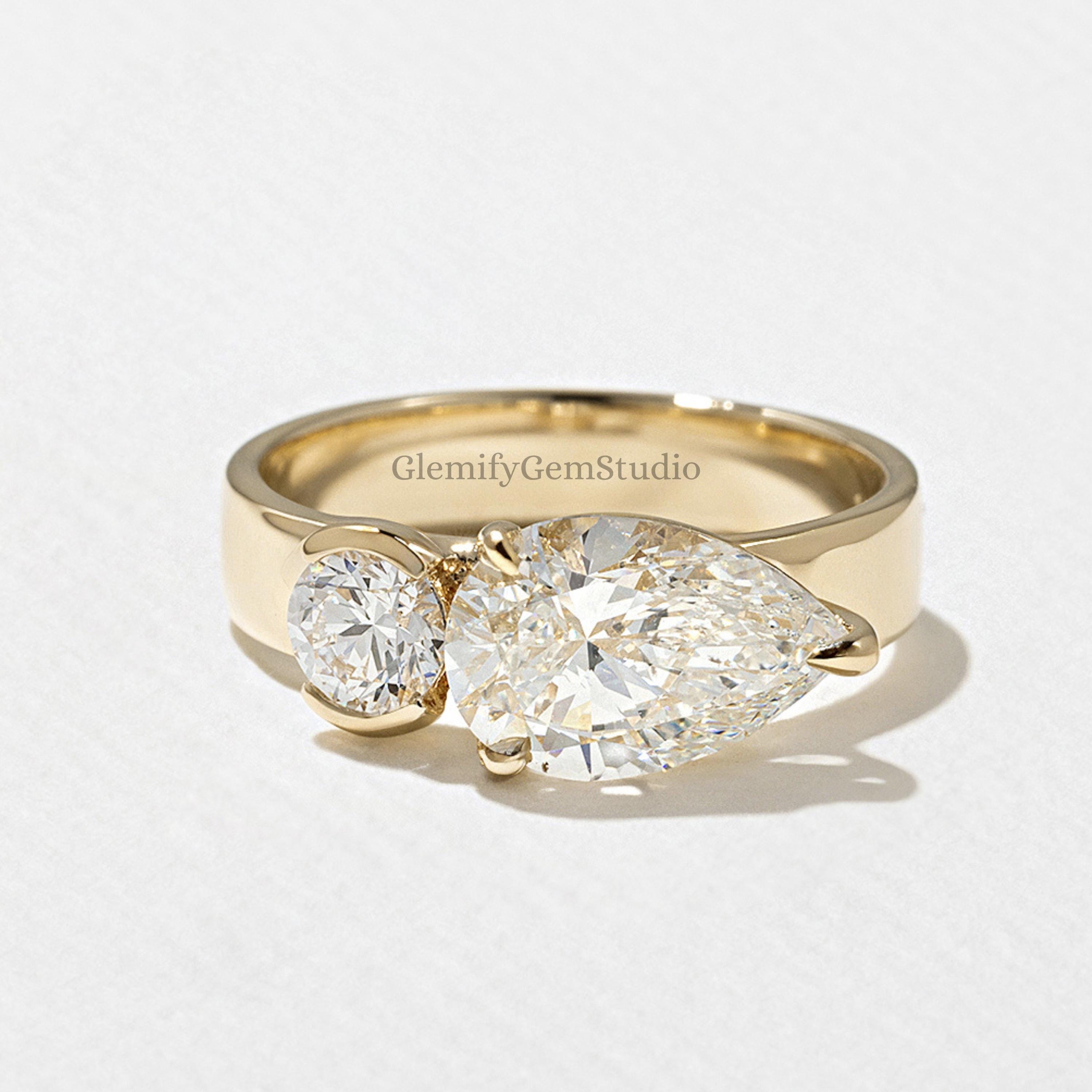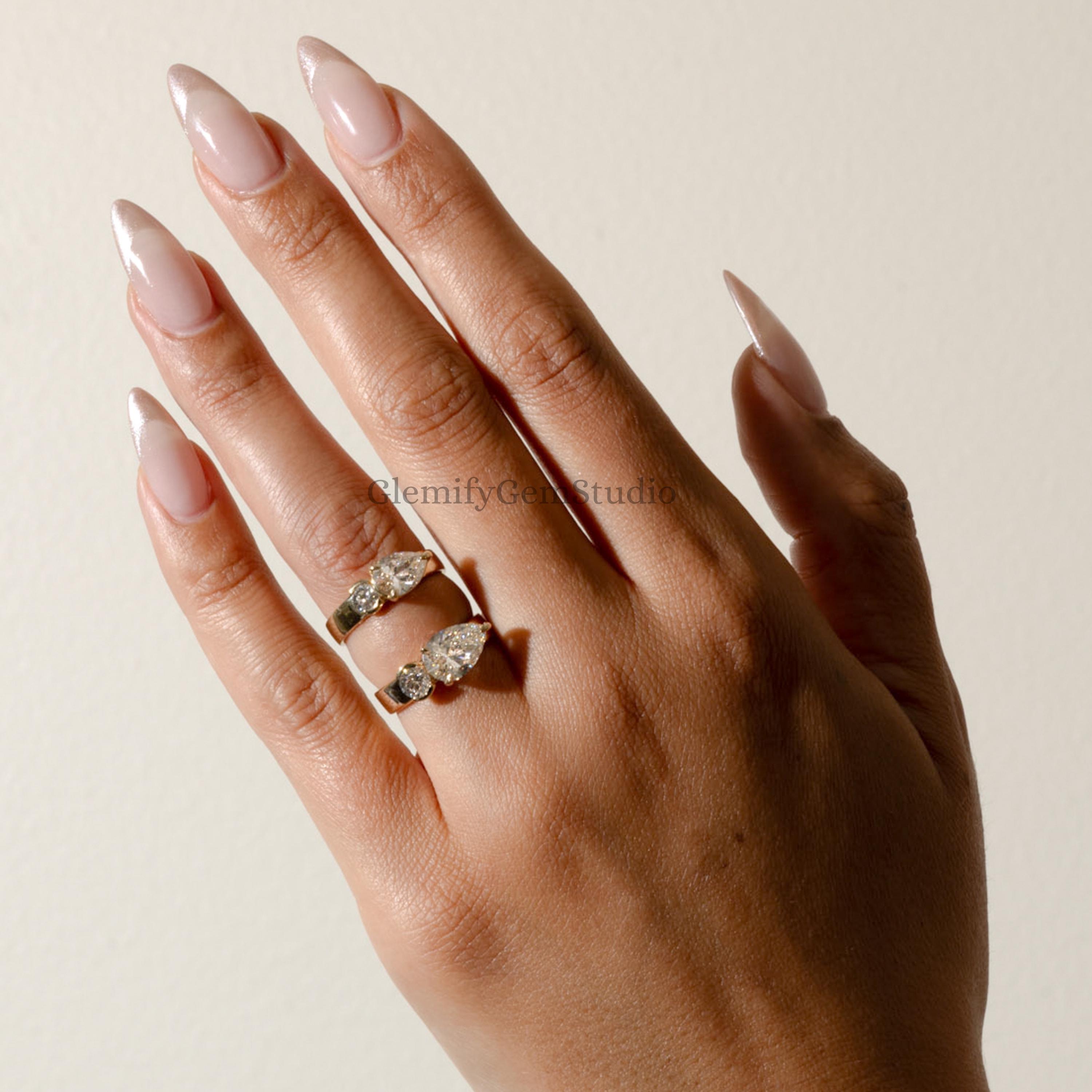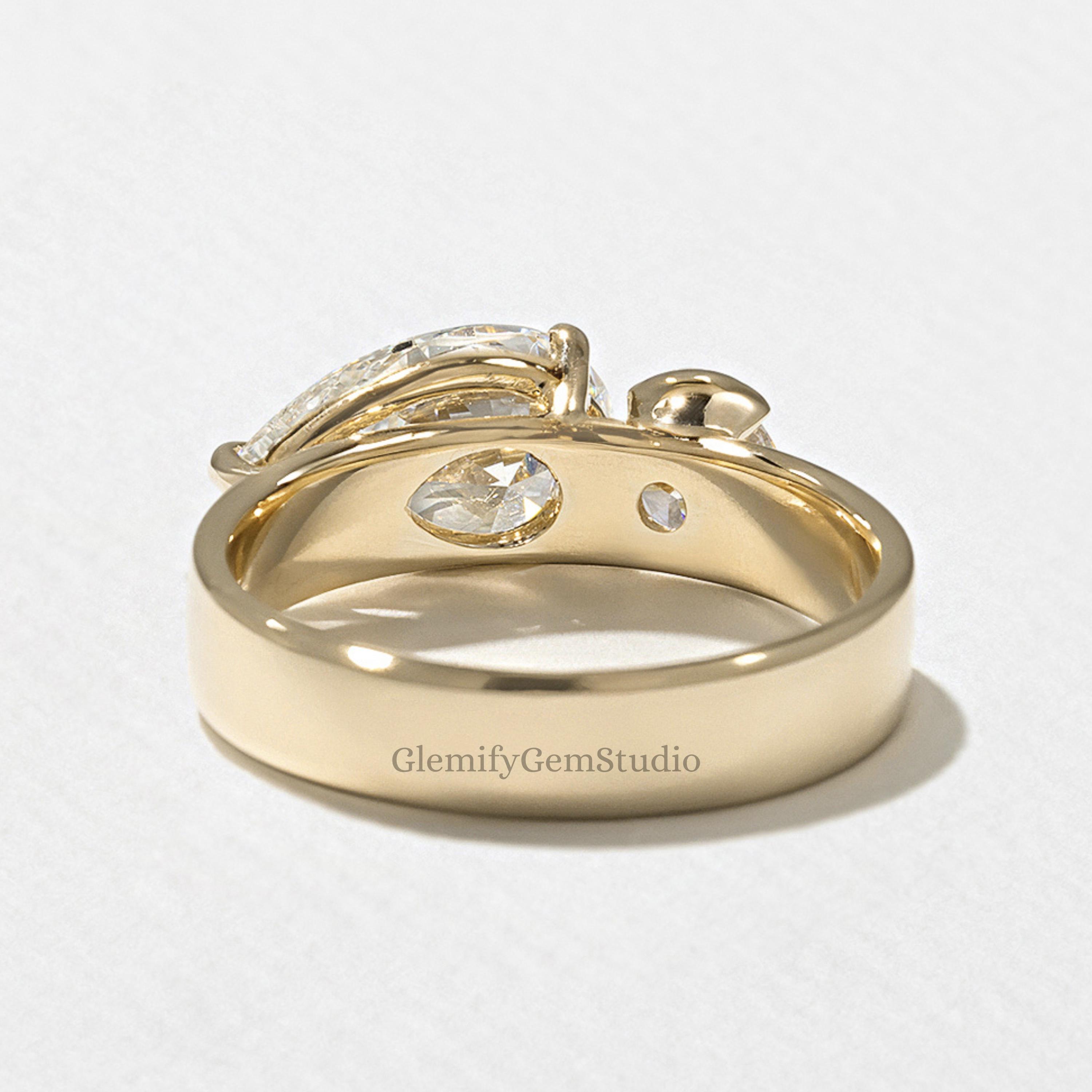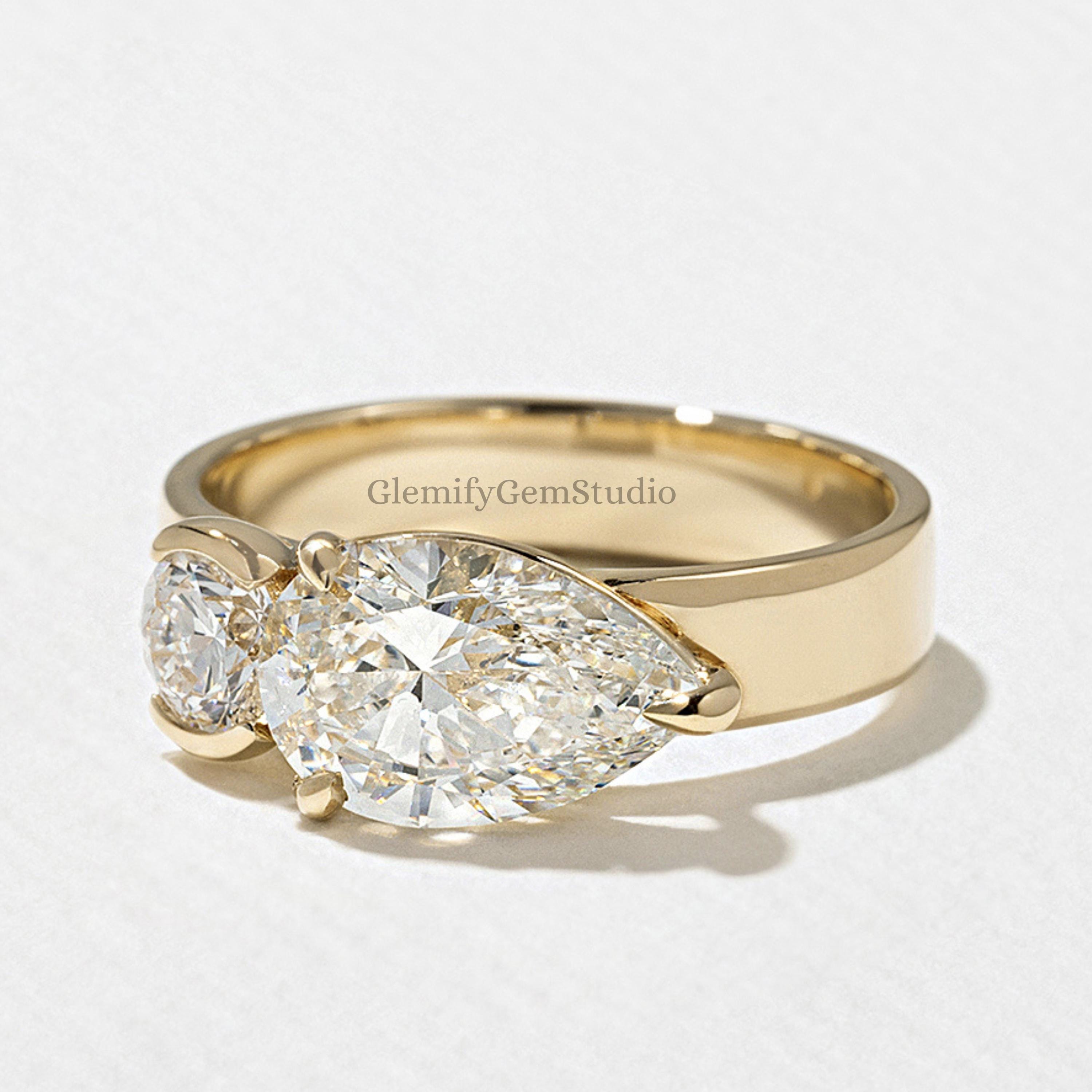 Bezel Set East West 3 TCW Pear & Round Cut Moissanite Diamond Engagement Ring Unique 14K Gold Solitaire 4MM Wedding Band Anniversary Ring