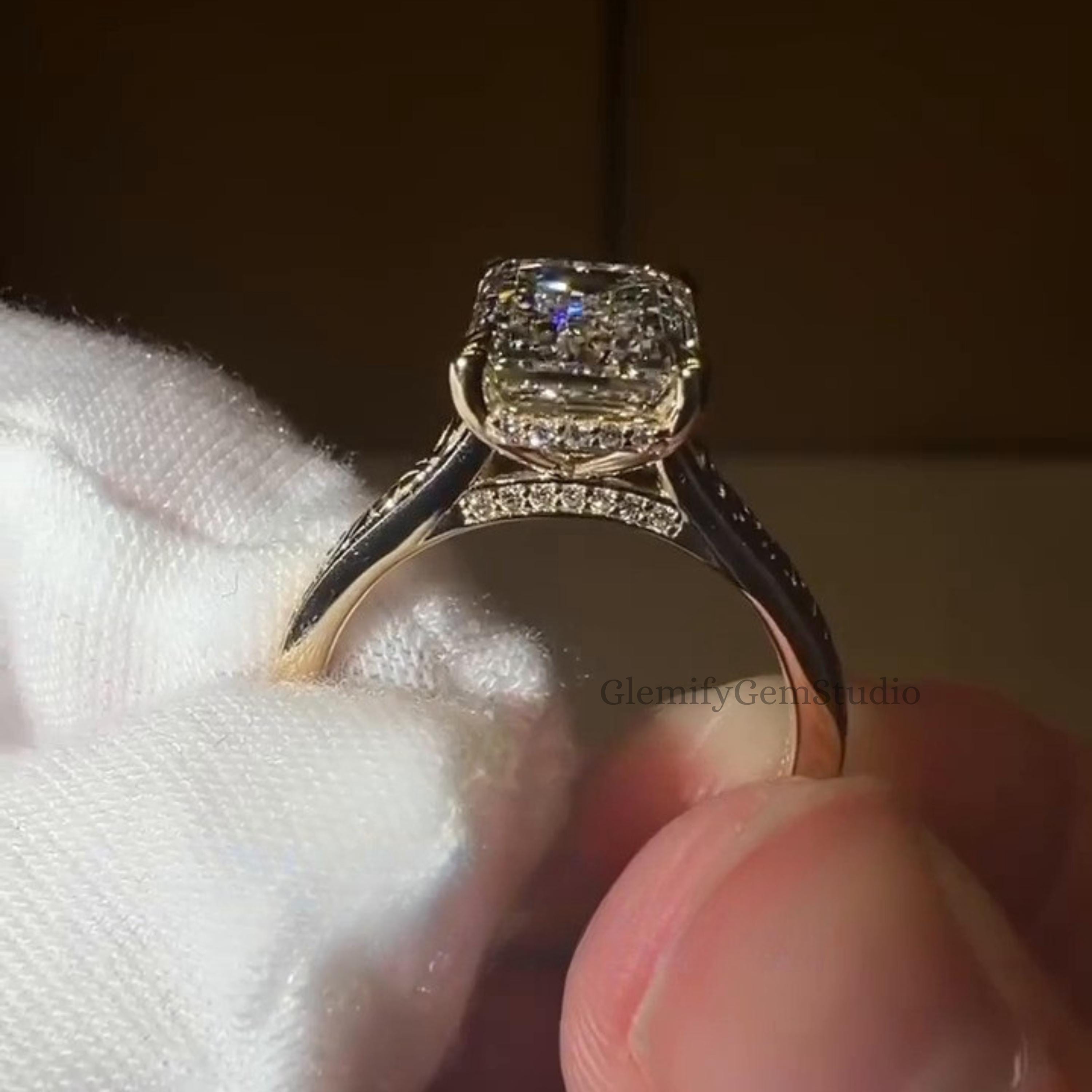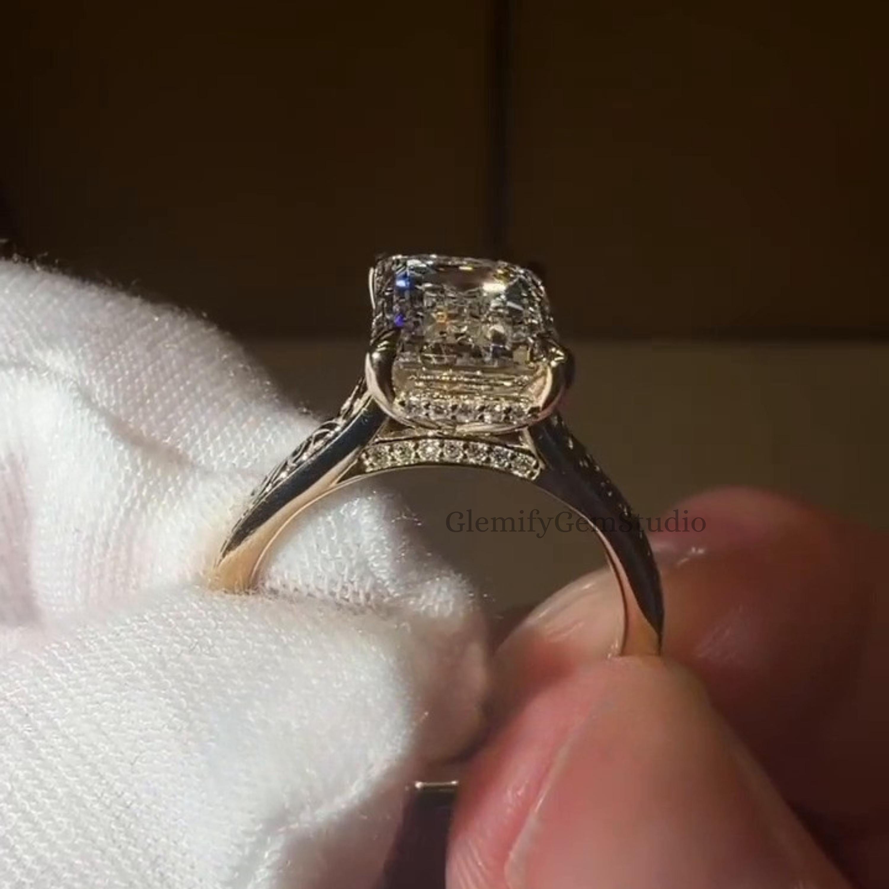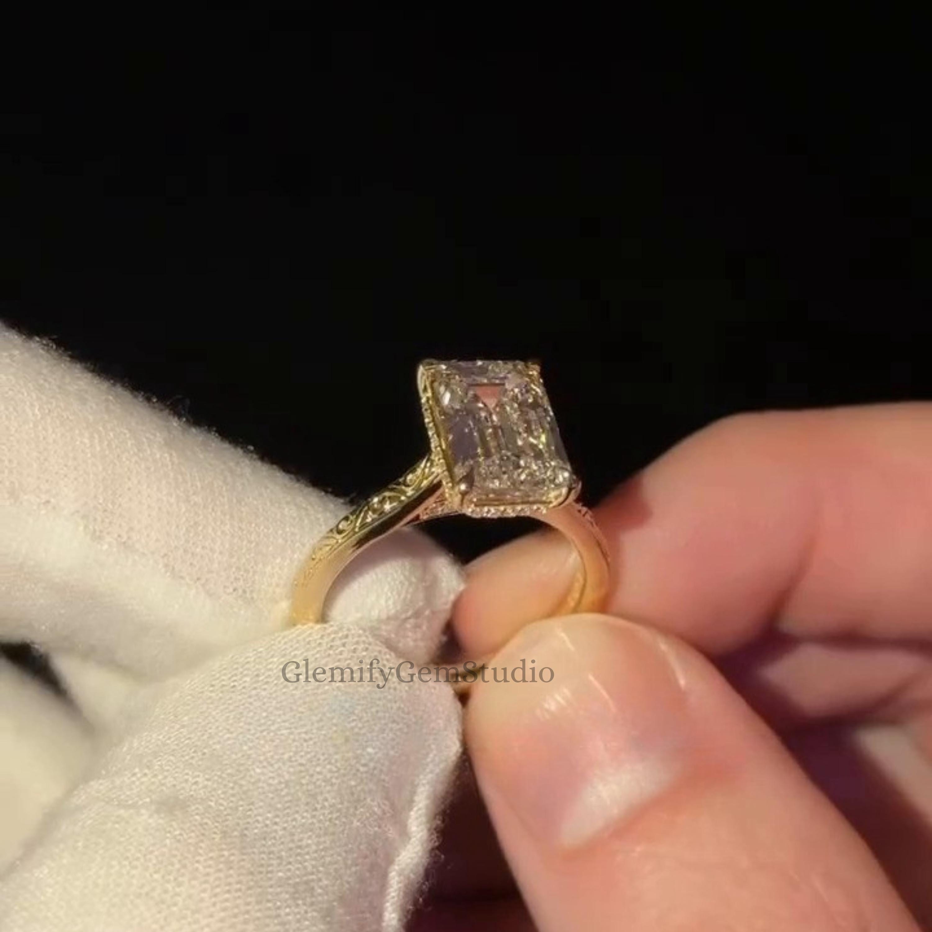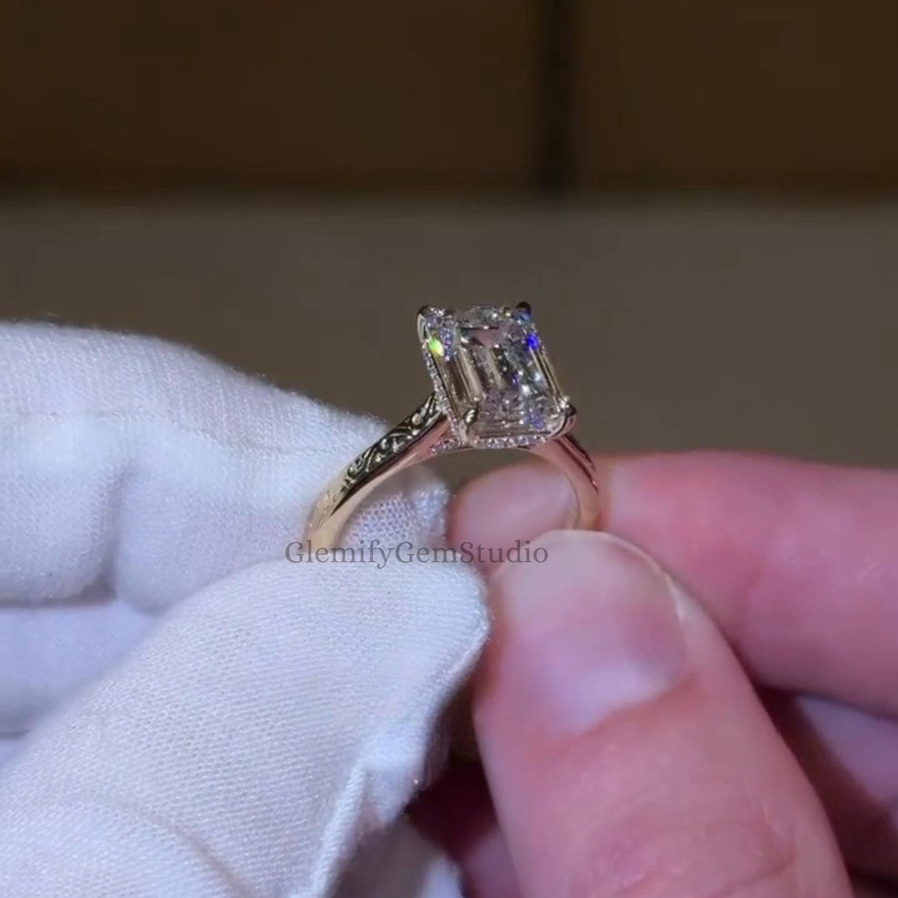 Vintage 4 CT Emerald Cut Moissanite Engagement Ring With Hidden Halo And Bridge Pave Set 14K Solid Gold Dainty Engraving Band Wedding Ring