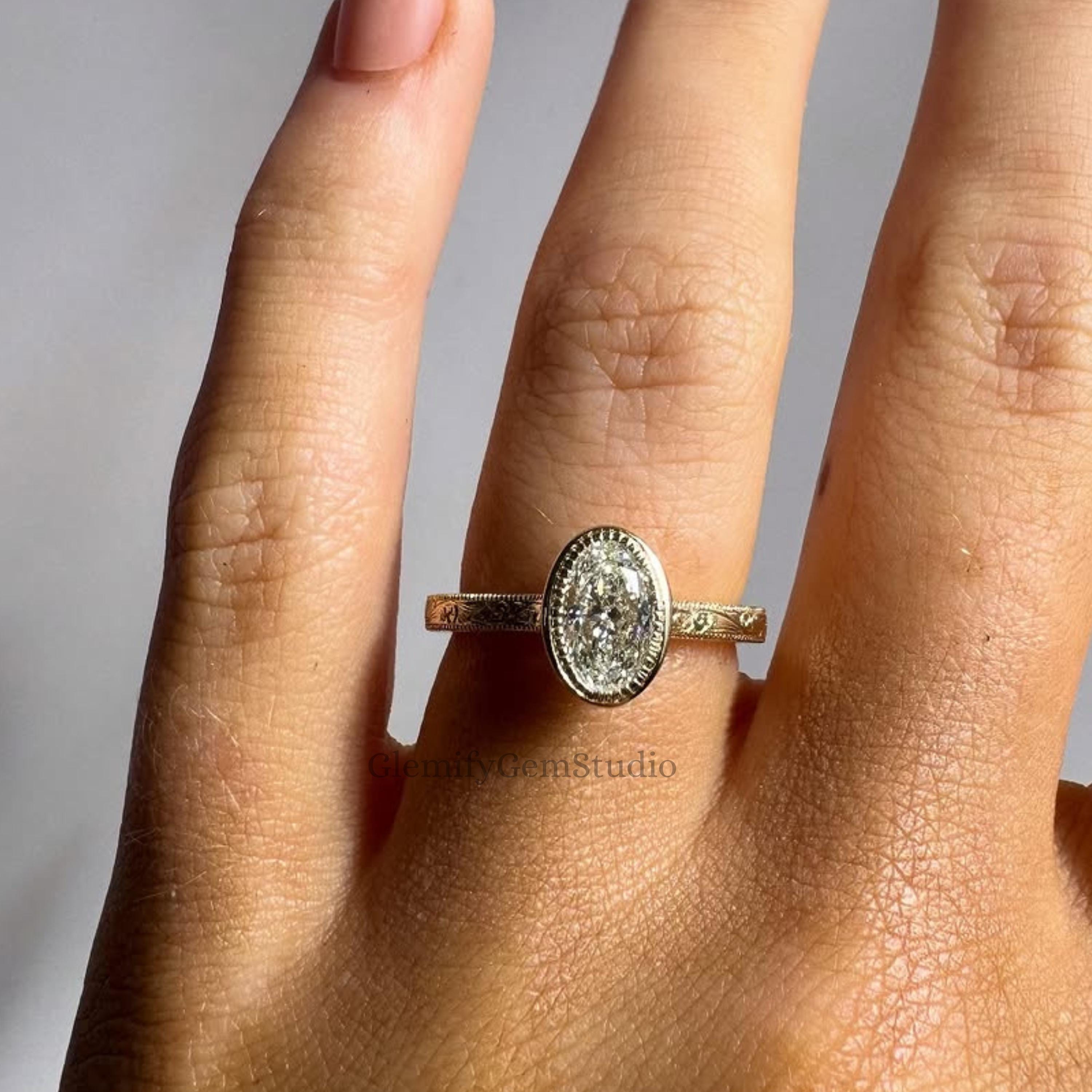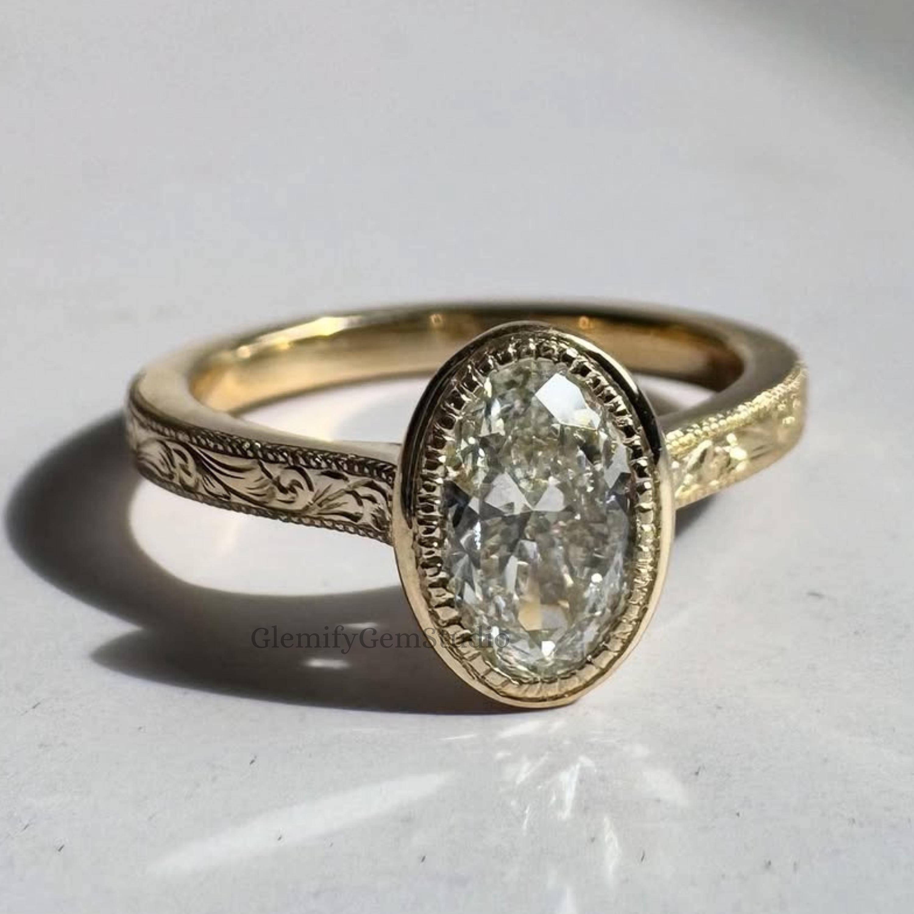 Vintage 2 CT Bezel Set Oval Cut IGI Lab Grown Diamond Engagement Ring 14K Solid Gold Unique Hand engraved Wedding Ring Perfect Gift Ring