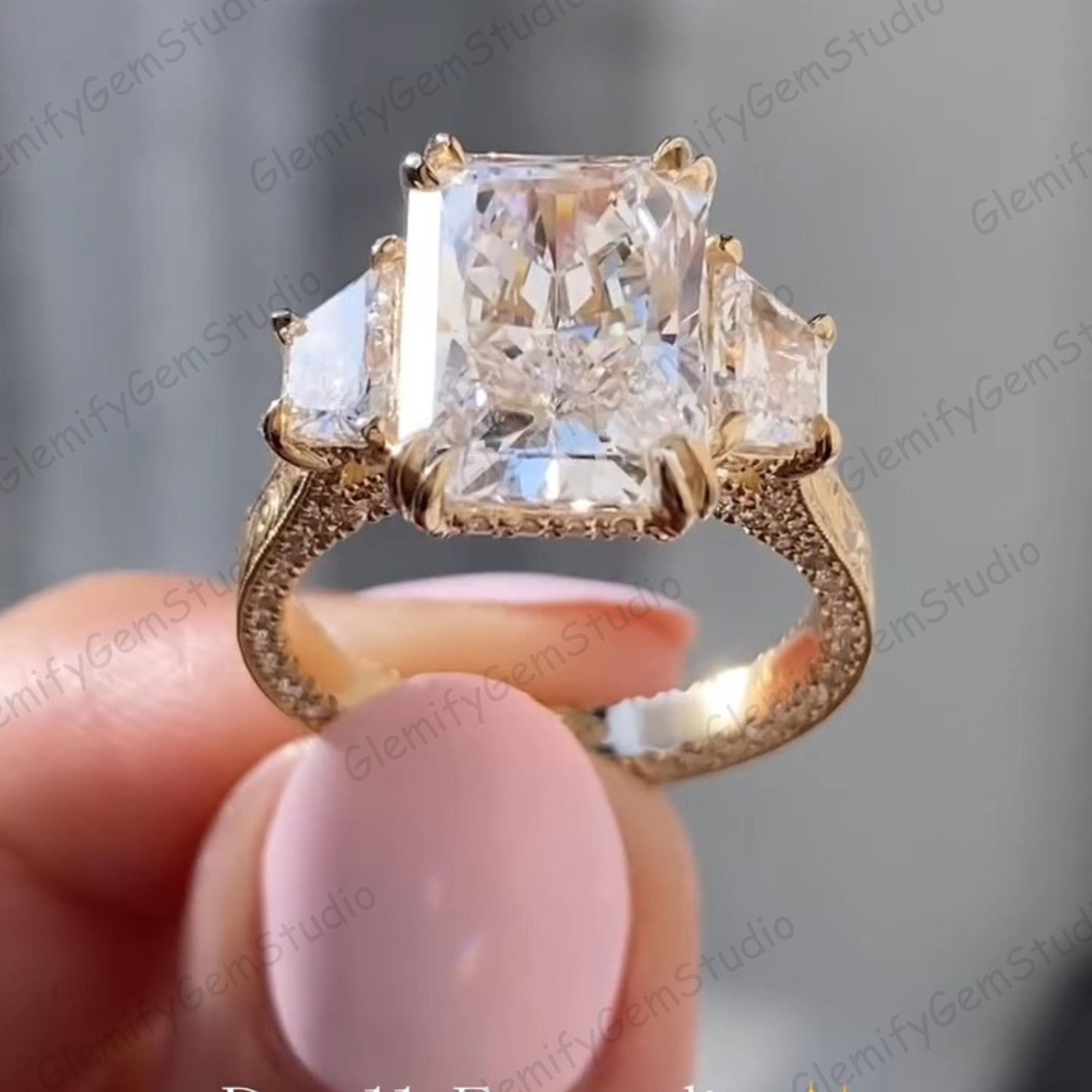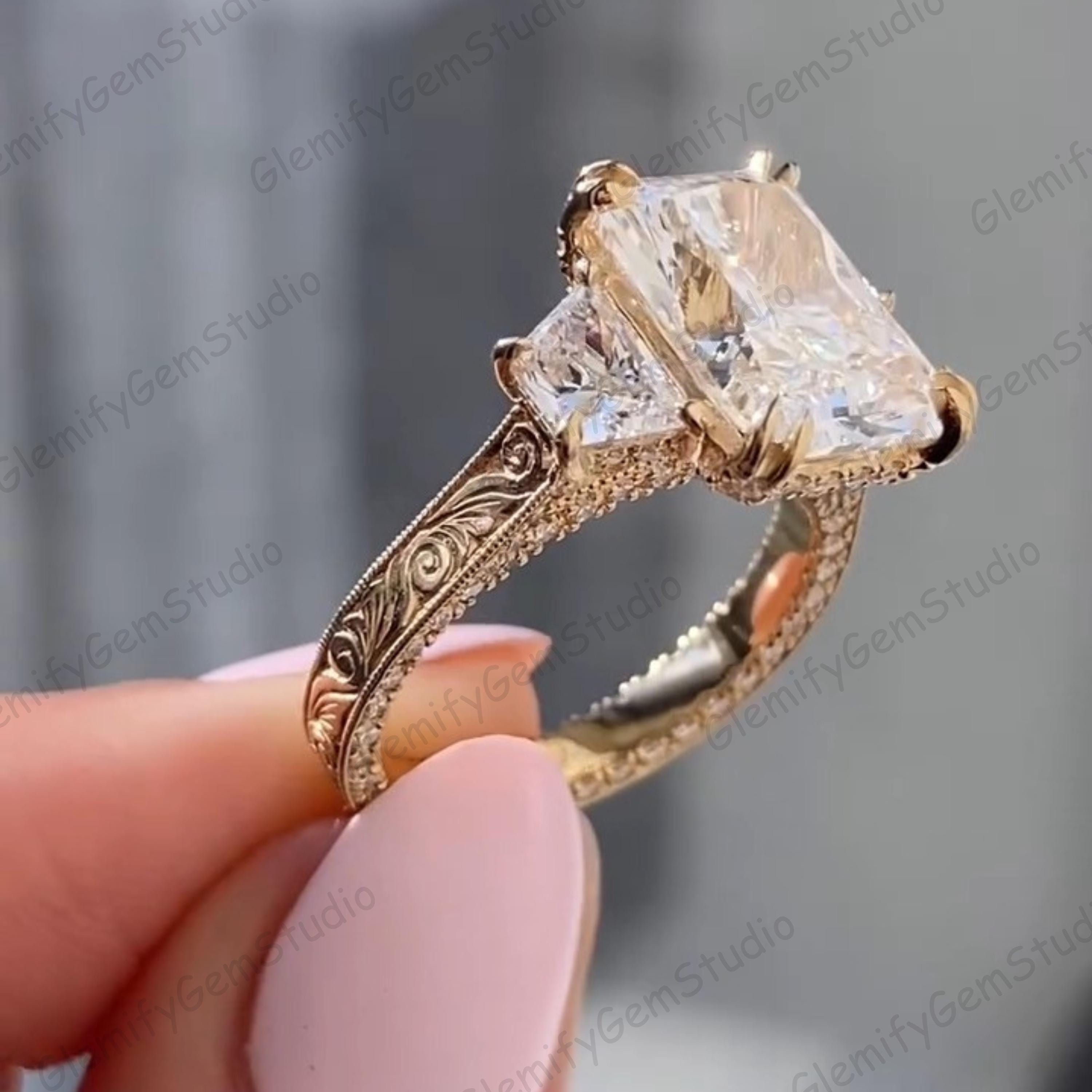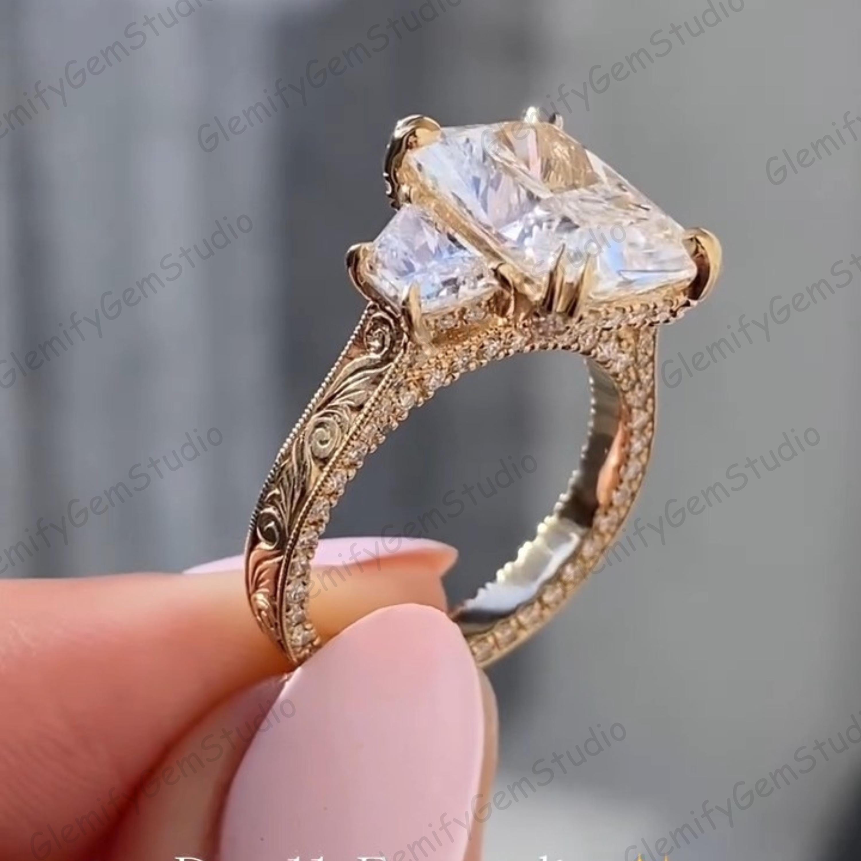 Vintage 3 CT Radiant & Trapezoid Cut Trilogy Lab Grown Diamond Double Prong Engagement Ring 14K Solid Gold Hand Engraved Band Wedding Ring