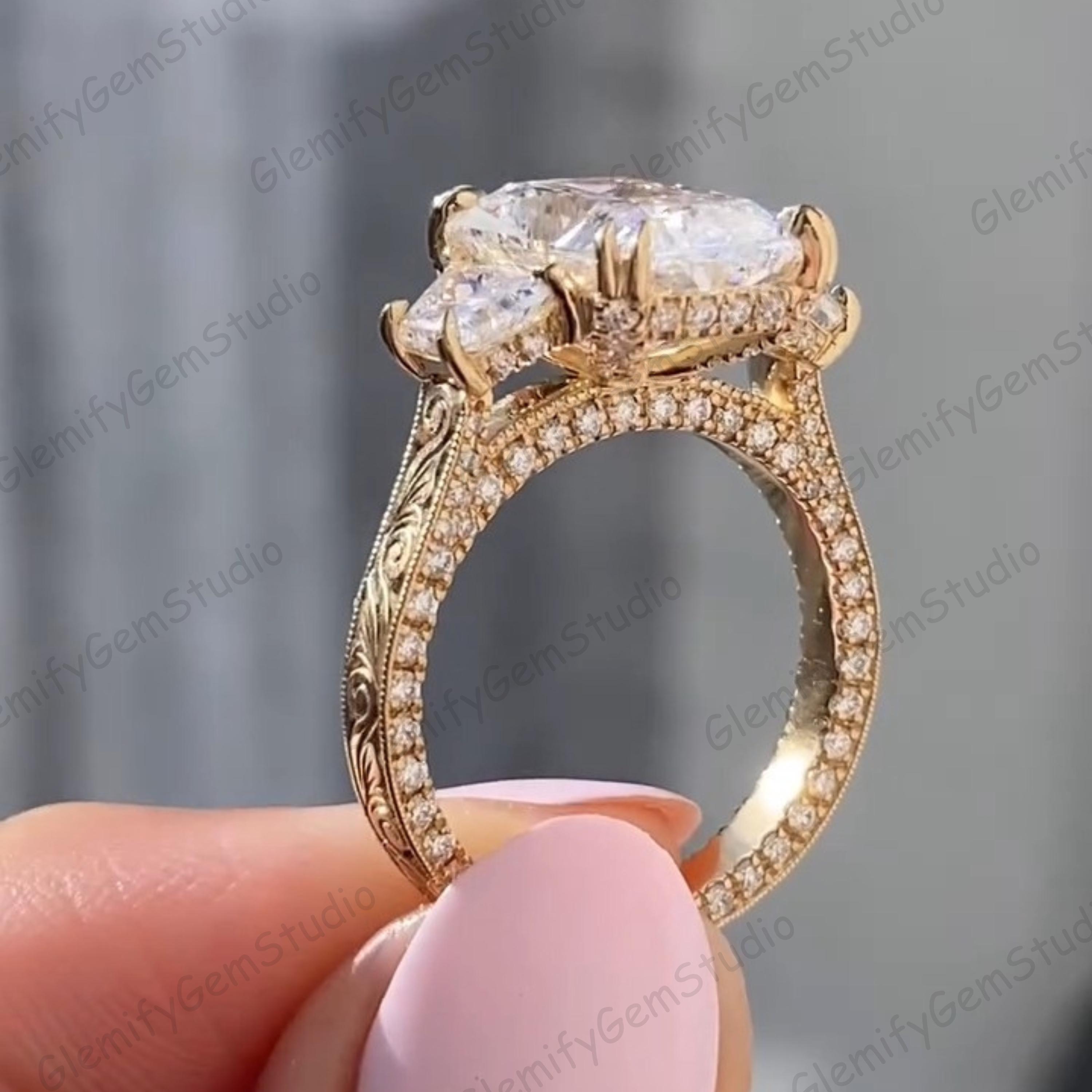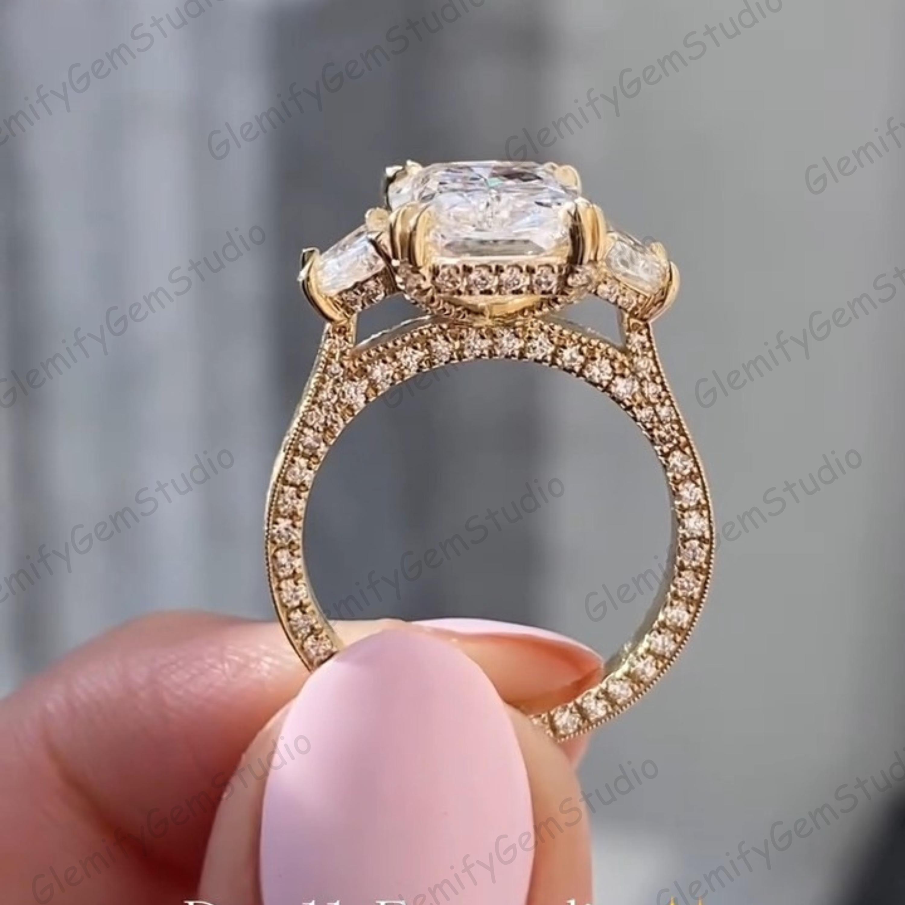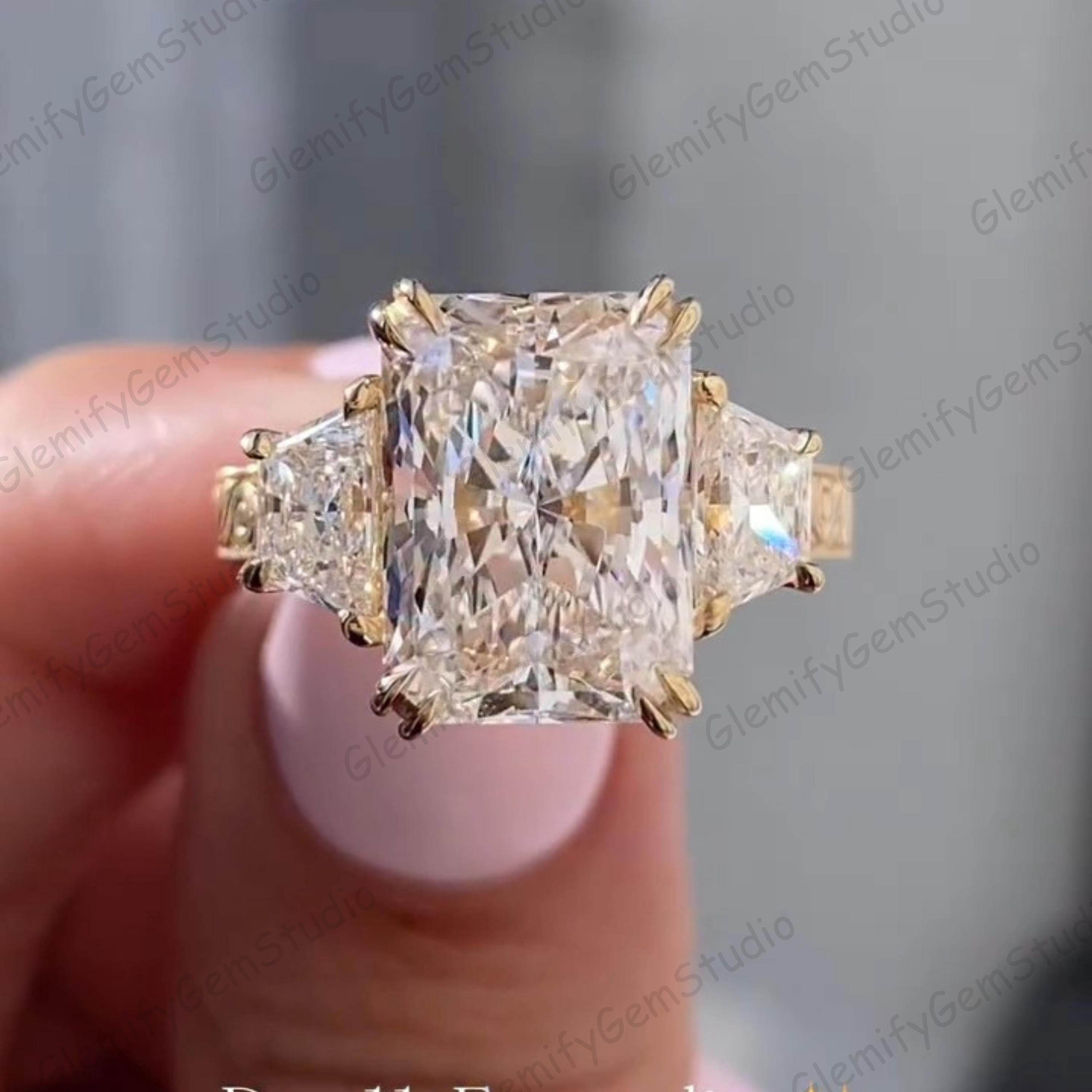 Vintage 3 CT Radiant & Trapezoid Cut Trilogy Lab Grown Diamond Double Prong Engagement Ring 14K Solid Gold Hand Engraved Band Wedding Ring
