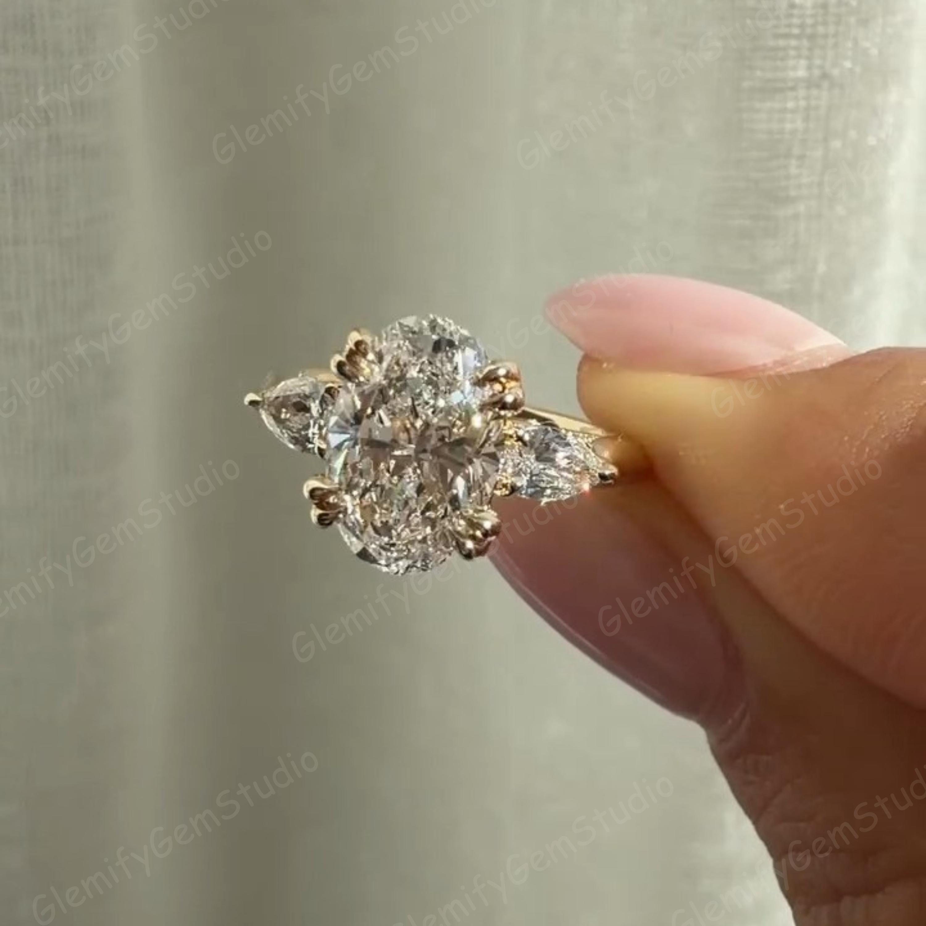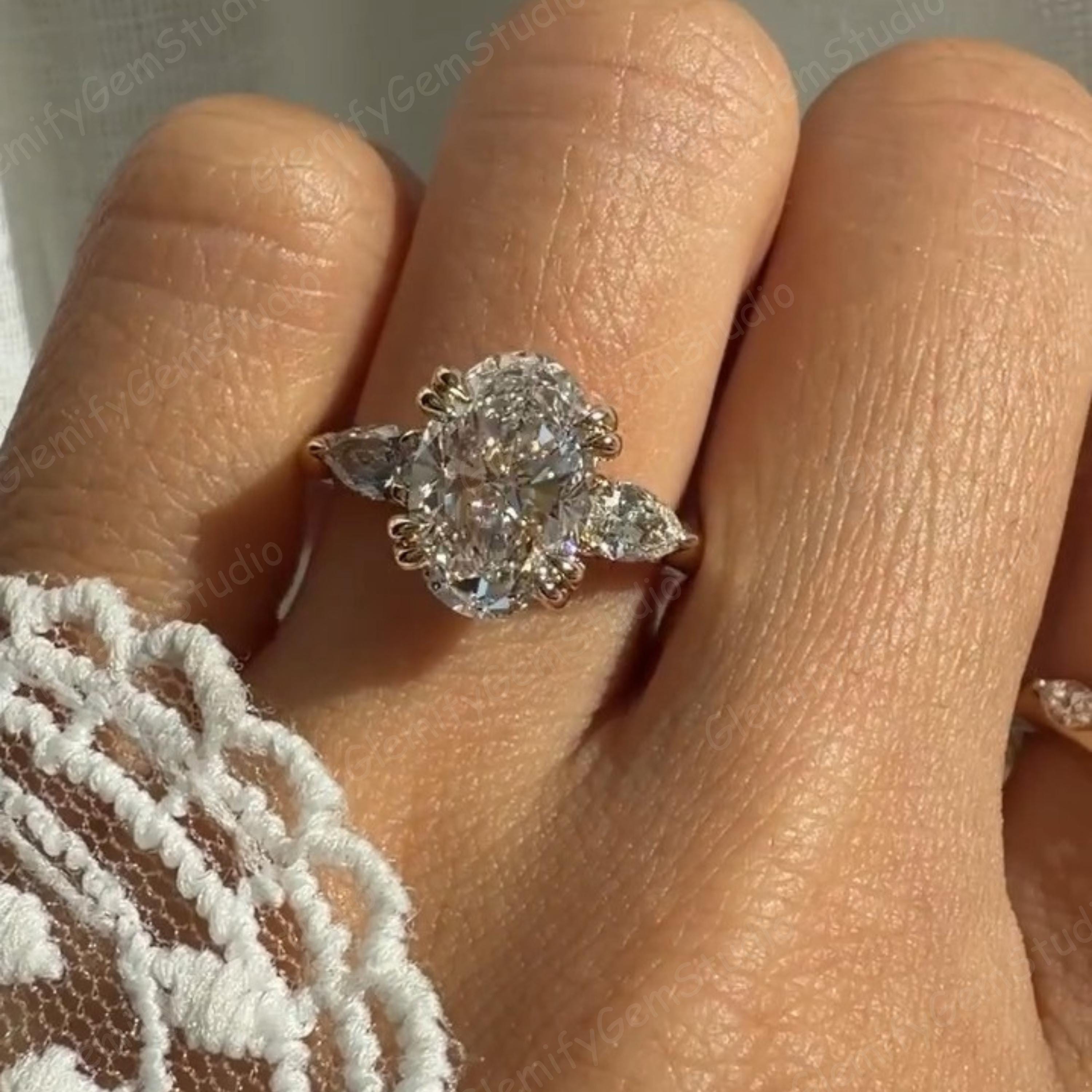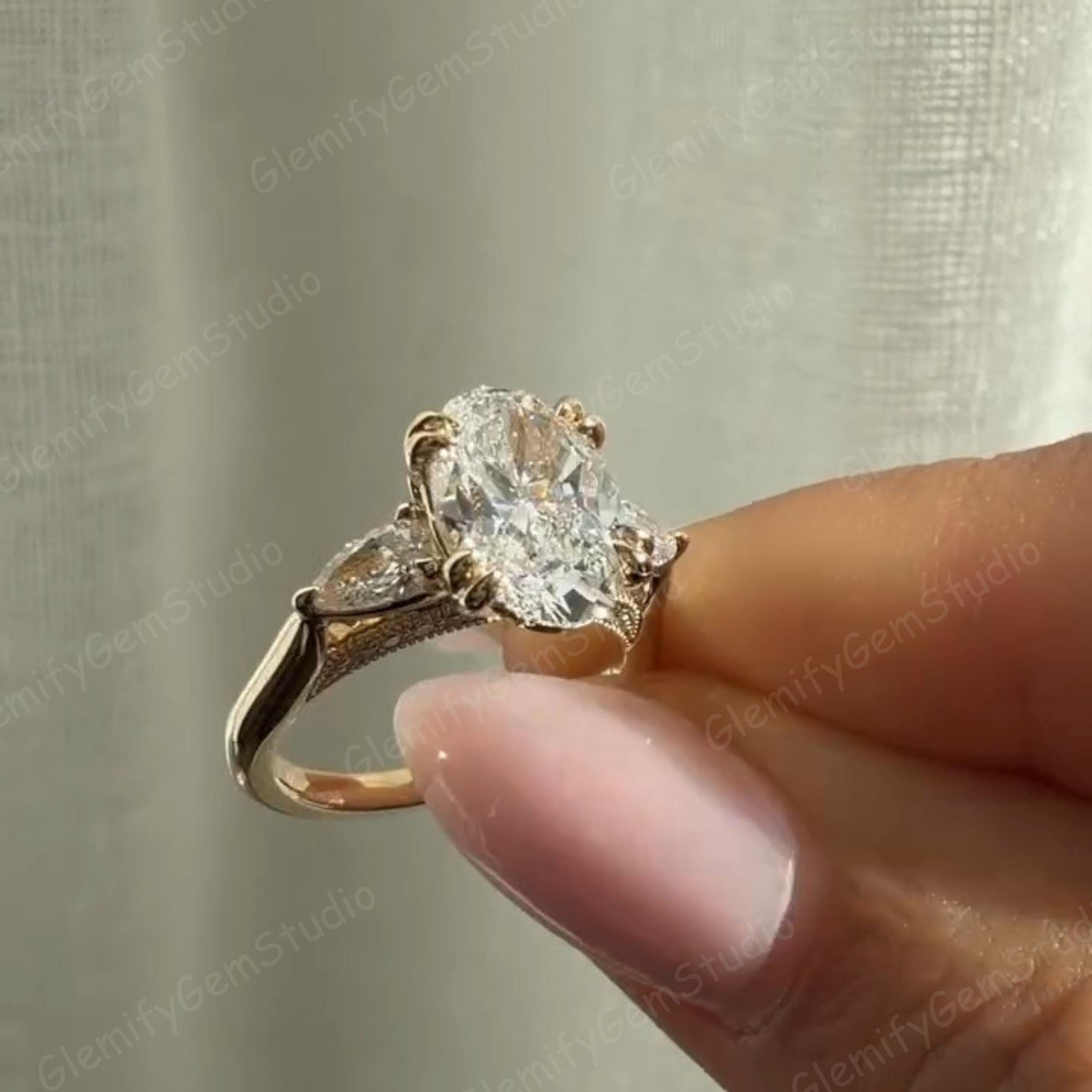 Unique 3 CT Double Claw Prong Oval Cut Three Stone IGI Lab Grown Diamond Engagement Ring 14K Solid Gold Cathedral Setting Wedding Ring