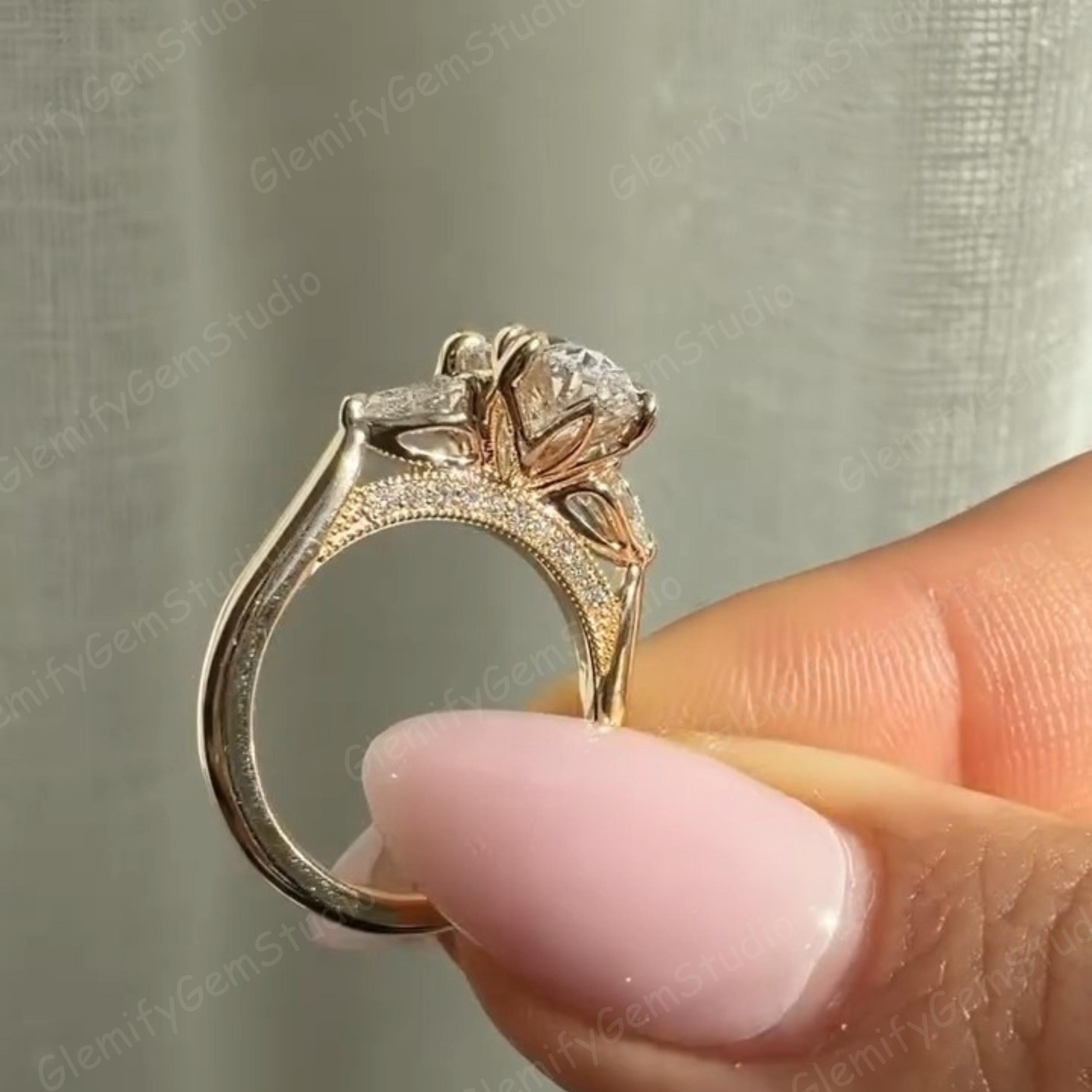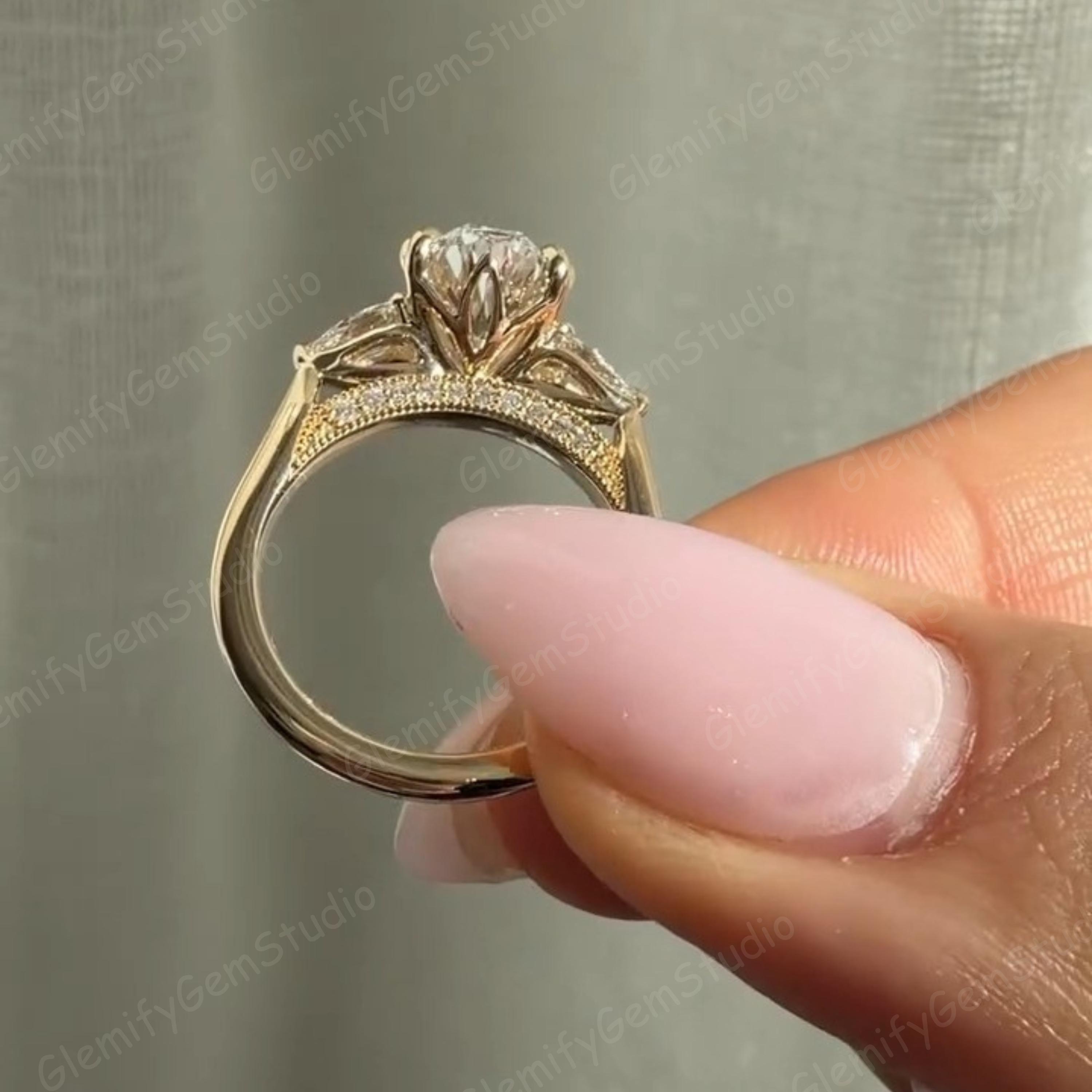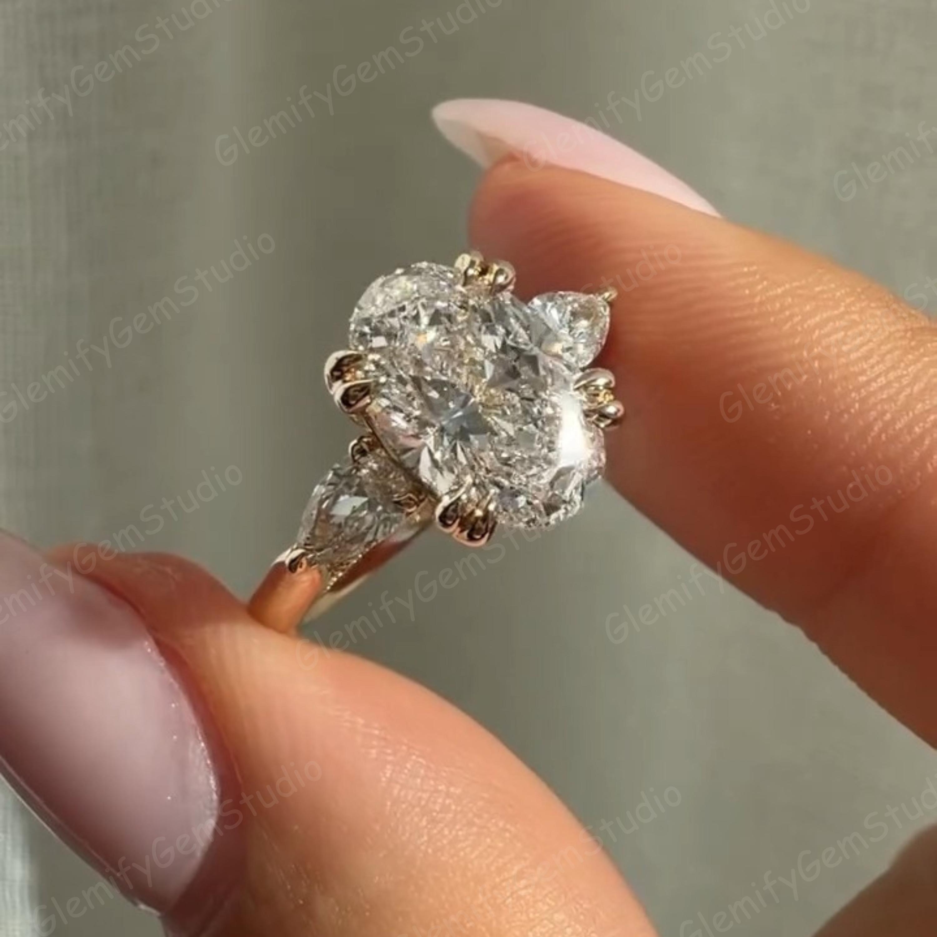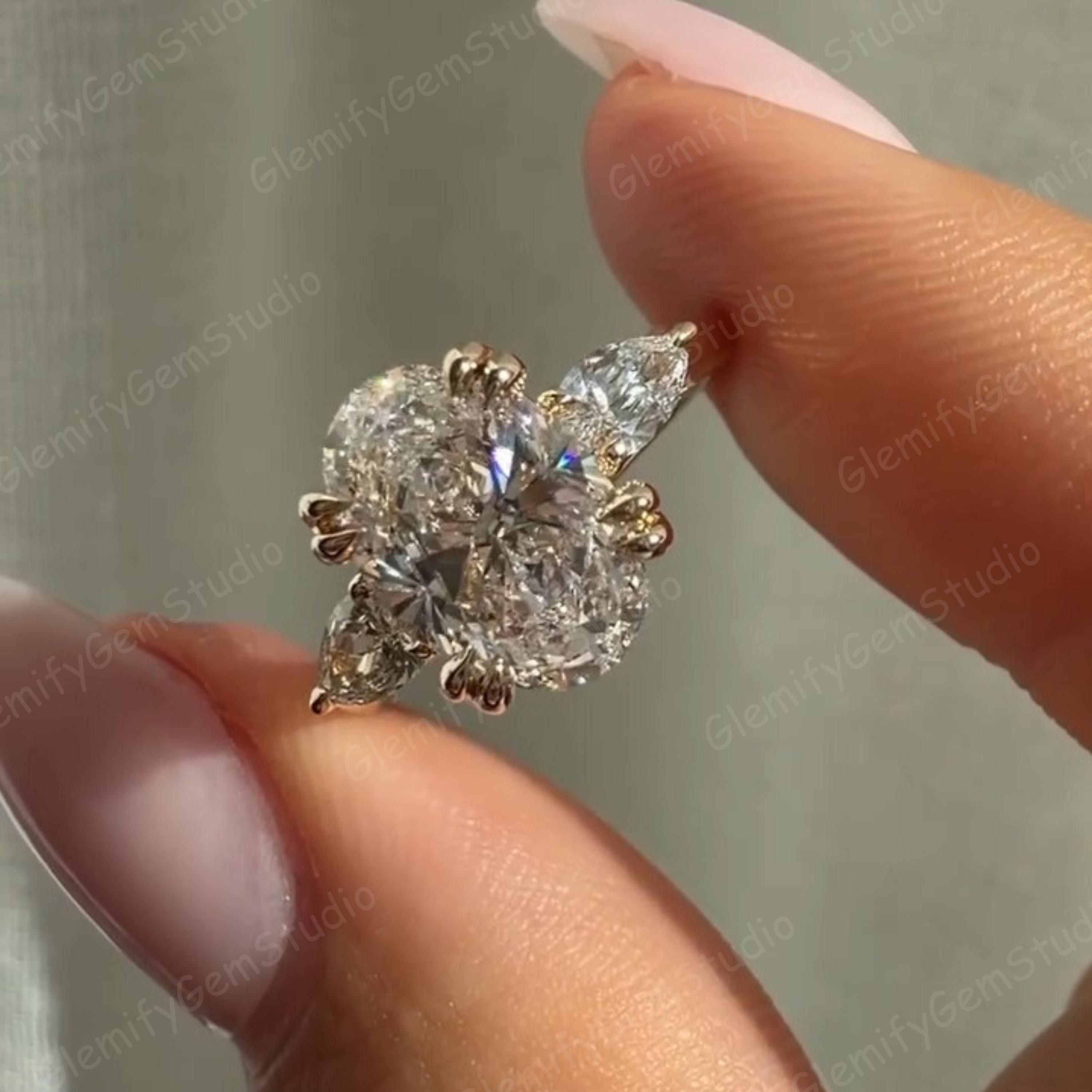 Unique 3 CT Double Claw Prong Oval Cut Three Stone IGI Lab Grown Diamond Engagement Ring 14K Solid Gold Cathedral Setting Wedding Ring